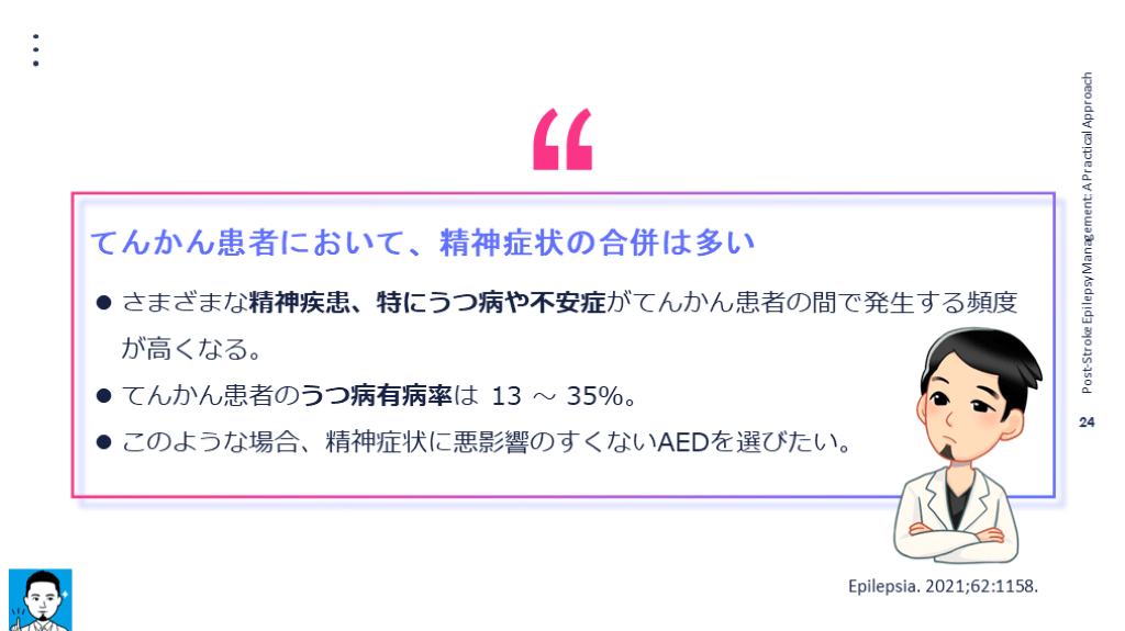 このような場合、精神症状に悪影響のすくないAEDを選びたい。 Epilepsia. 2021;62:1158.