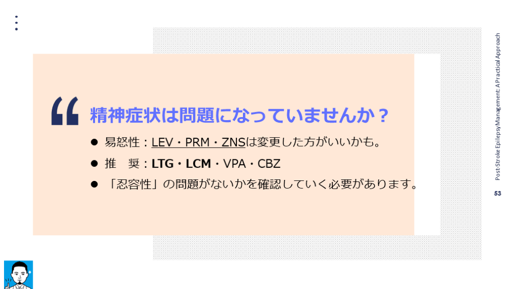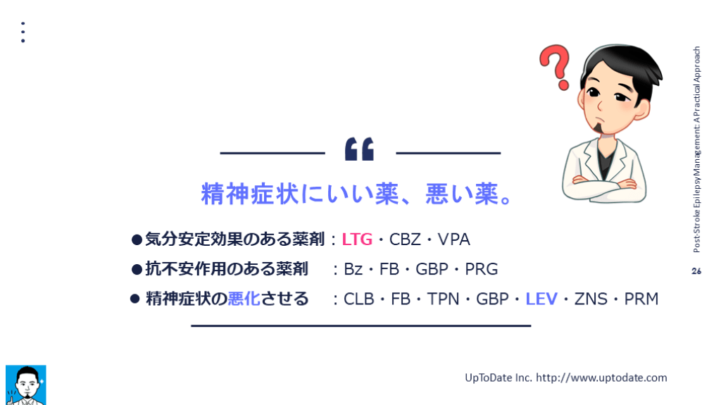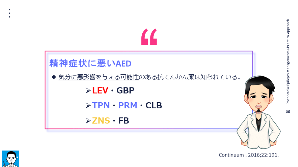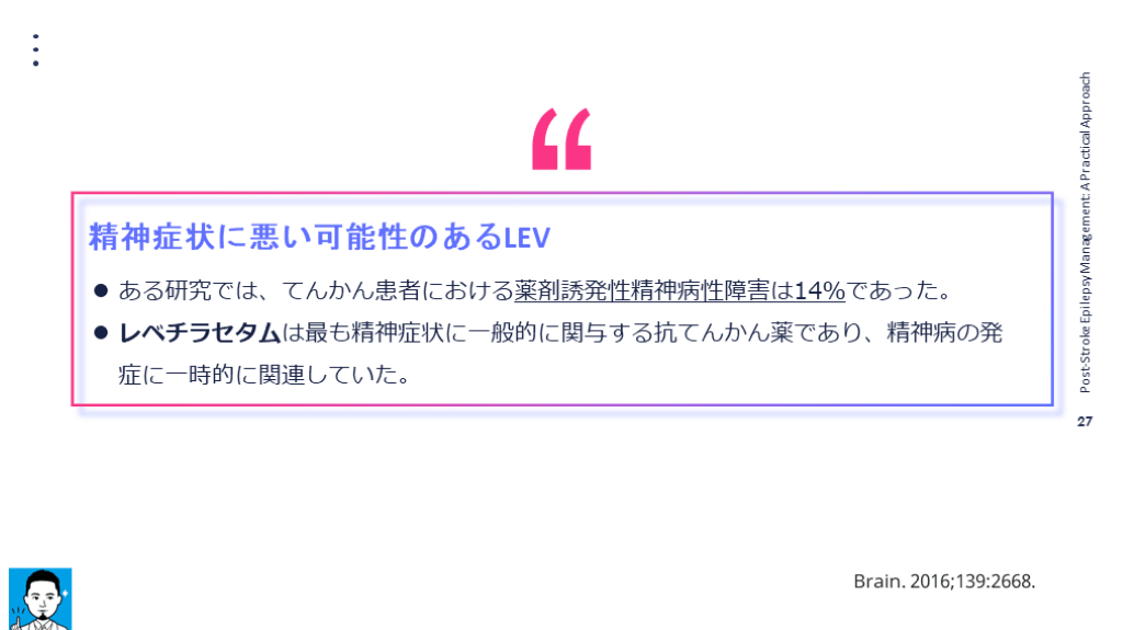 レベチラセタムは最も精神症状に一般的に関与する抗てんかん薬であり、精神病の発症に一時的に関連していた。 Brain. 2016;139:2668.