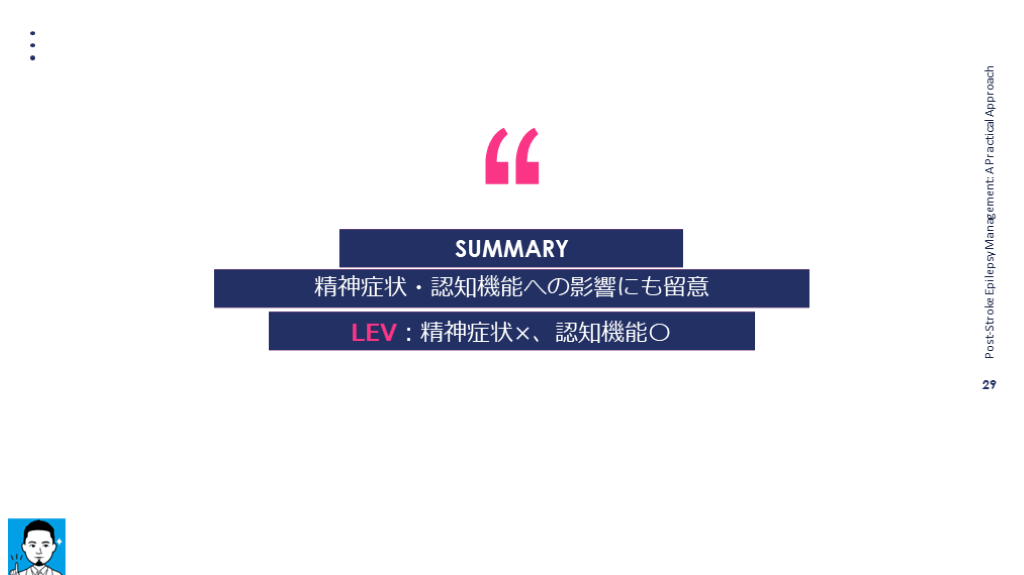 #29. SUMMARY 精神症状・認知機能への影響にも留意 LEV:精神症状×、認知機能〇