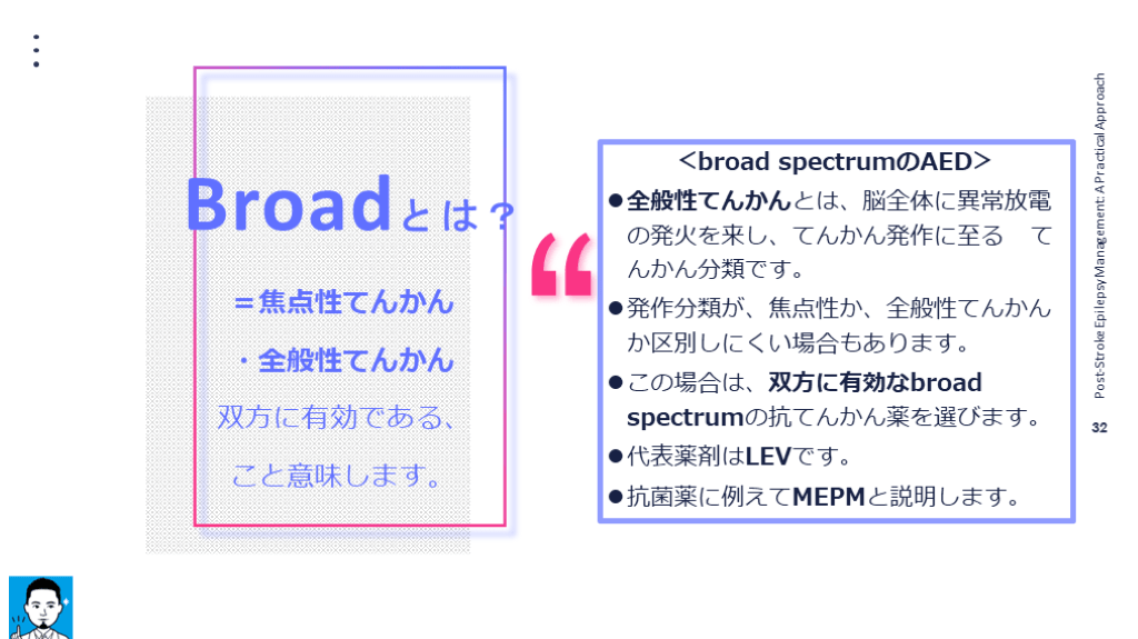 この場合は、双方に有効なbroad spectrumの抗てんかん薬を選びます。