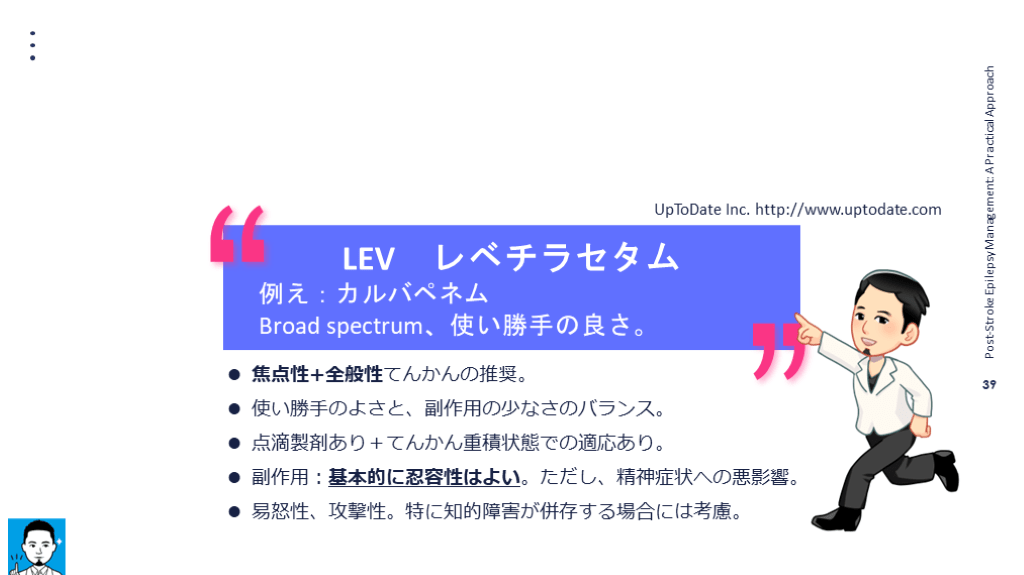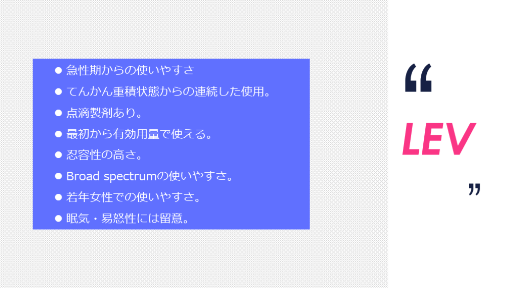 LEVは精神症状に注意。(攻撃性や易怒性のリスクあり)