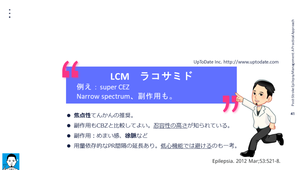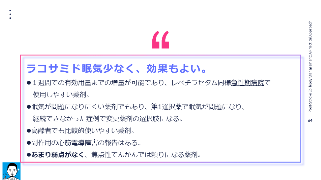 #64. ラコサミド眠気少なく、効果もよい。 1週間での有効用量までの増量が可能であり、レベチラセタム同様急性期病院で