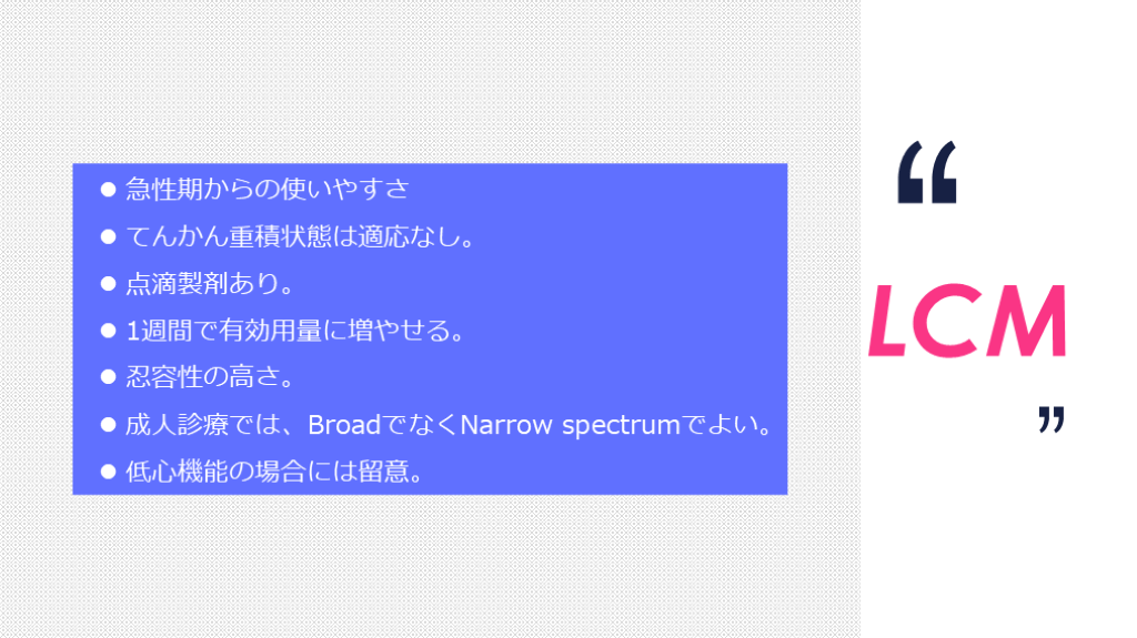 成人診療では、BroadでなくNarrow spectrumでよい。