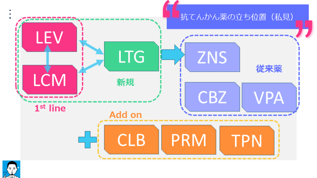 #68. LEV LCM LTG ZNS CBZ VPA CLB PRM TPN 1st line 新規 従来薬 Add on 抗てんかん薬の立ち位置(私見)