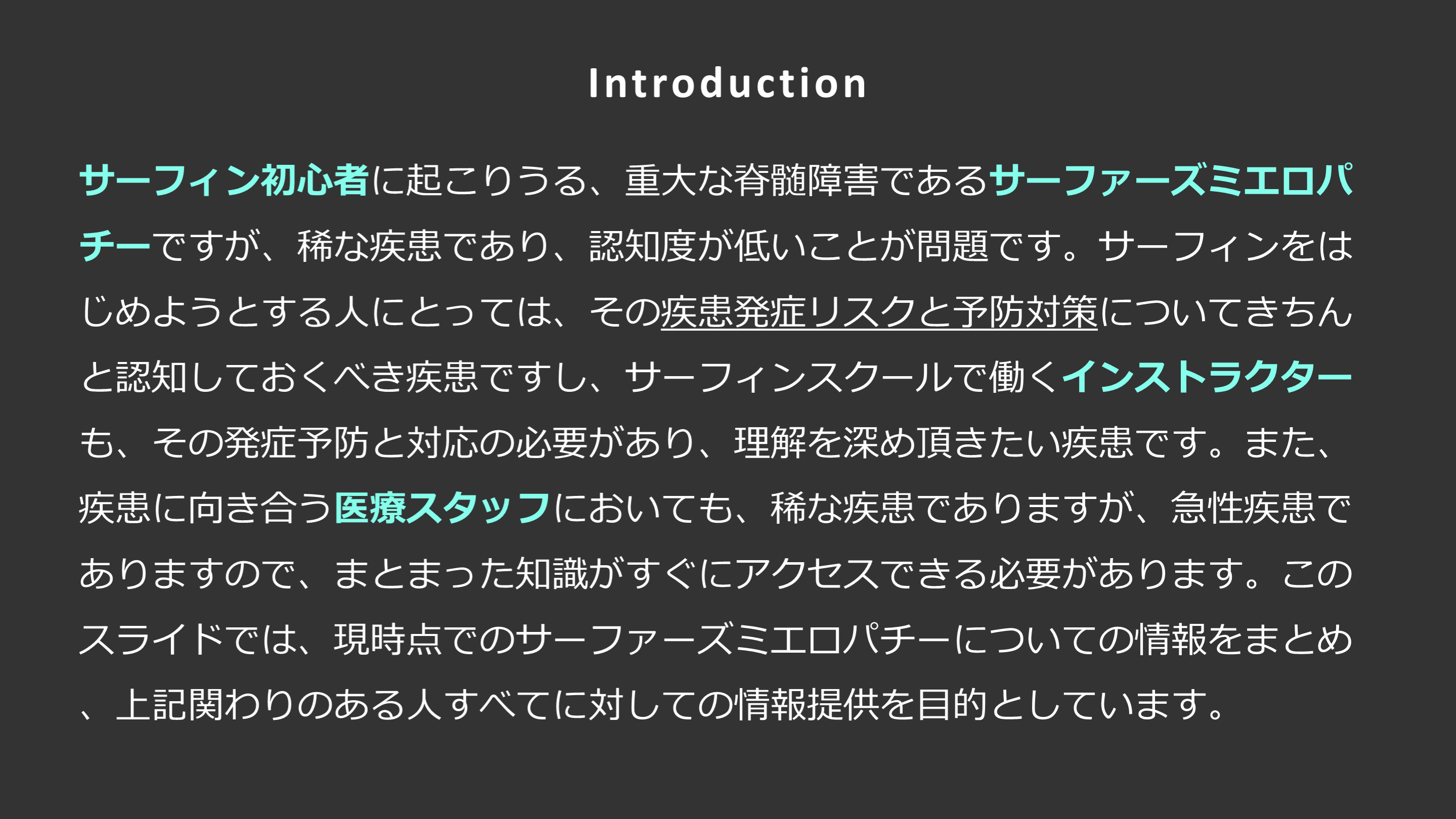 #2. Introduction サーフィン初心者に起こりうる、重大な脊髄障害であるサーファーズミエロパチーですが、稀な疾患であり、認知度が低いことが問題です。サーフィンをはじめようとする人にとっては、その疾患発症リスクと予防対策についてきちんと認知しておくべき疾患ですし、サーフィンスクールで働くインストラクターも、その発症予防と対応の必要があり、理解を深め頂きたい疾患です。また、疾患に向き合う医療スタッフにおいても、稀な疾患でありますが、急性疾患でありますので、まとまった知識がすぐにアクセスできる必要があります。このスライドでは、現時点でのサーファーズミエロパチーについての情報をまとめ、上記関わりのある人すべてに対しての情報提供を目的としています。