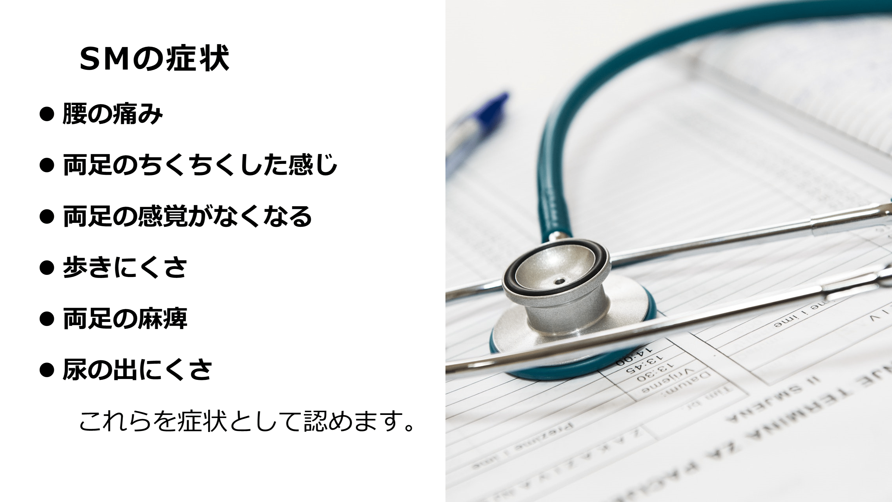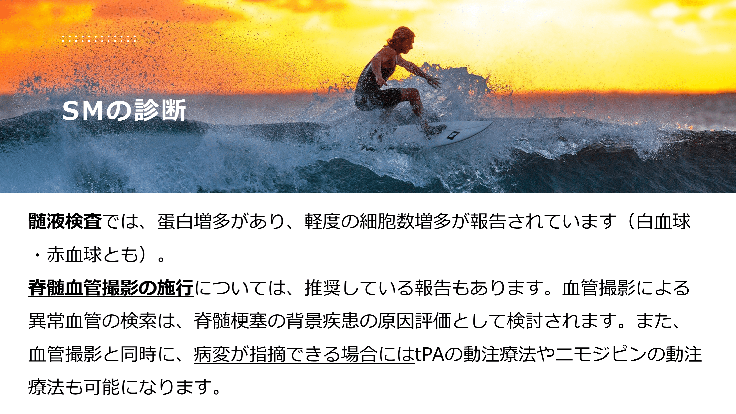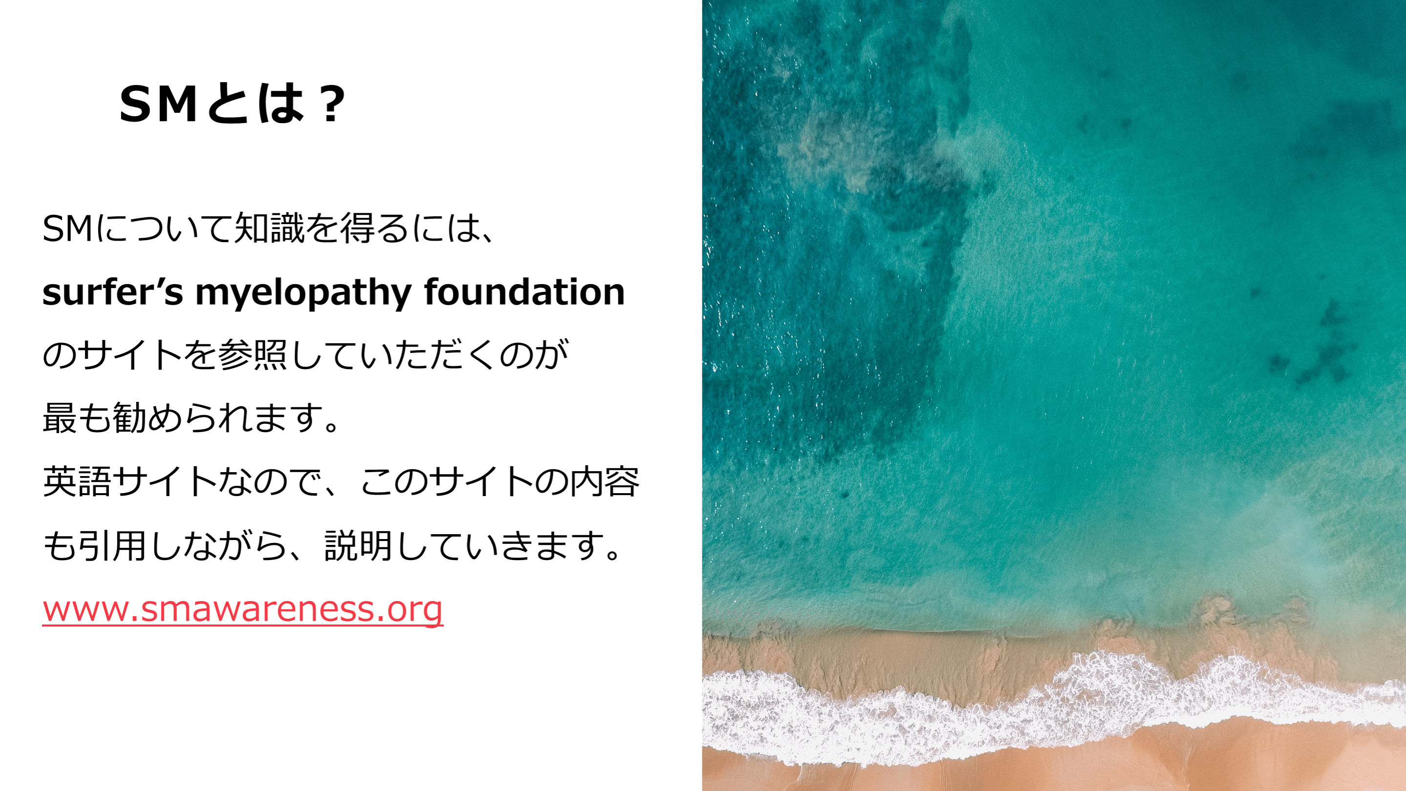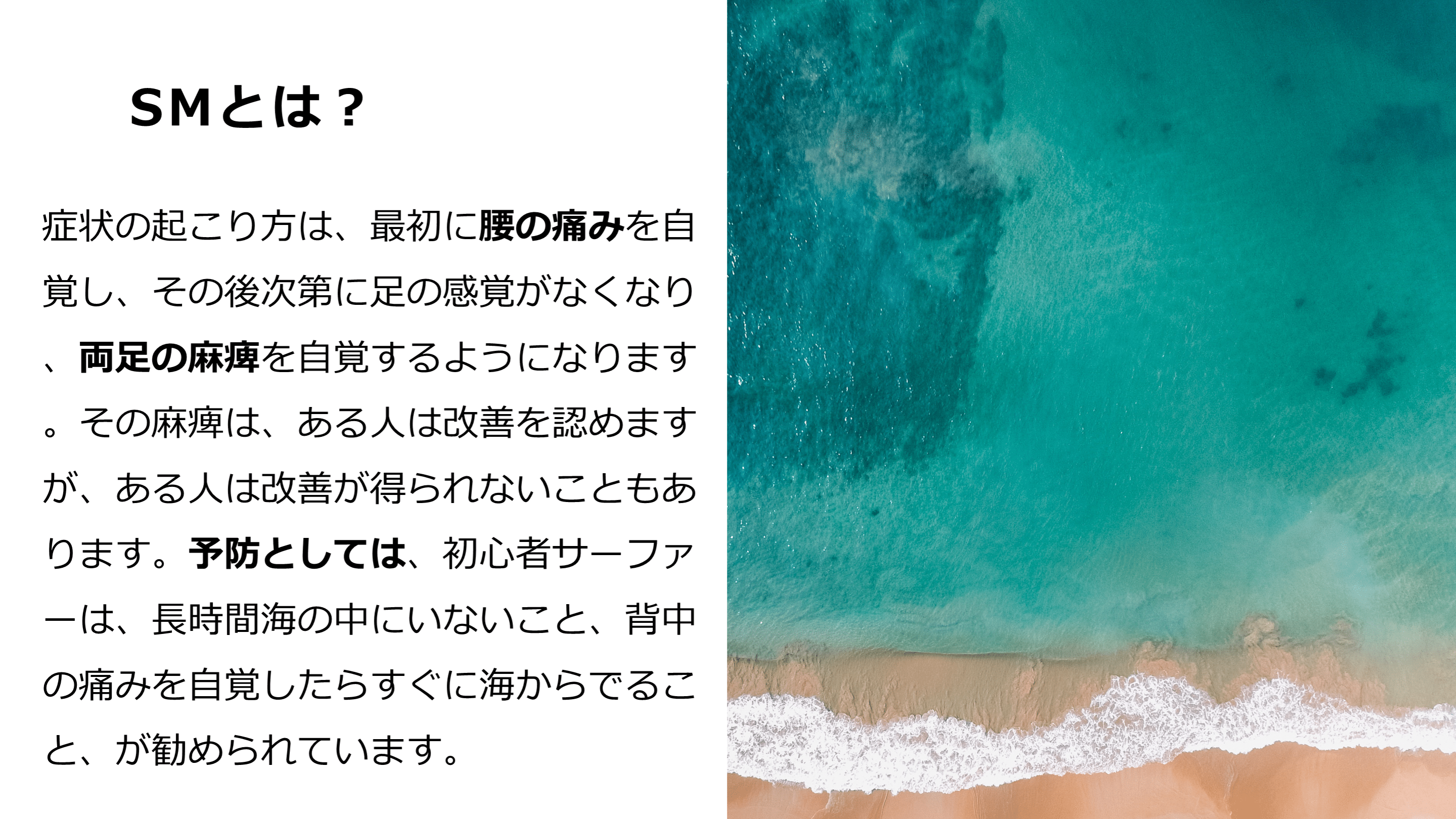 #6. SMとは? 症状の起こり方は、最初に腰の痛みを自覚し、その後次第に足の感覚がなくなり、両足の麻痺を自覚するようになります。その麻痺は、ある人は改善を認めますが、ある人は改善が得られないこともあります。予防としては、初心者サーファーは、長時間海の中にいないこと、背中の痛みを自覚したらすぐに海からでること、が勧められています。