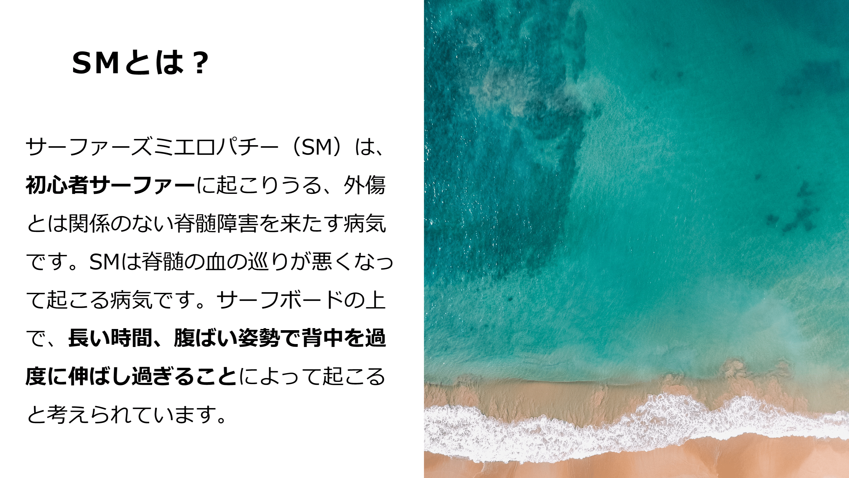 #5. SMとは? サーファーズミエロパチー(SM)は、初心者サーファーに起こりうる、外傷とは関係のない脊髄障害を来たす病気です。SMは脊髄の血の巡りが悪くなって起こる病気です。サーフボードの上で、長い時間、腹ばい姿勢で背中を過度に伸ばし過ぎることによって起こると考えられています。