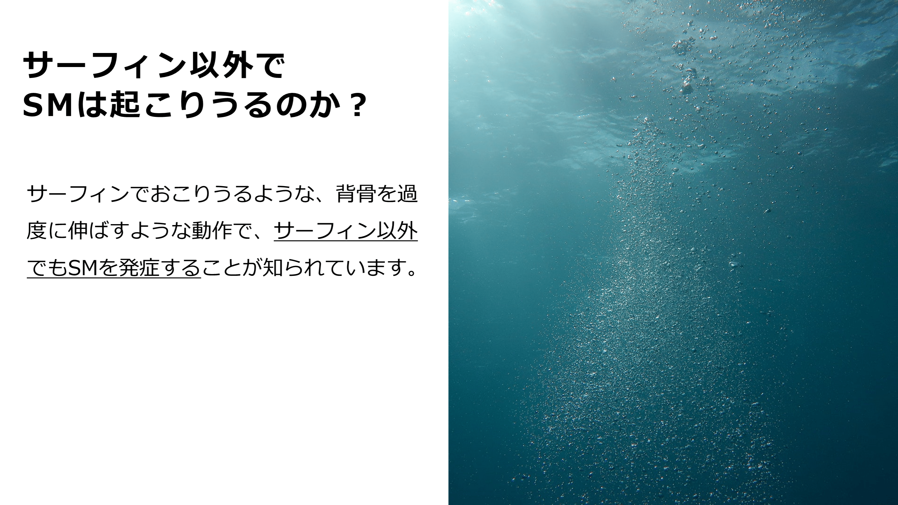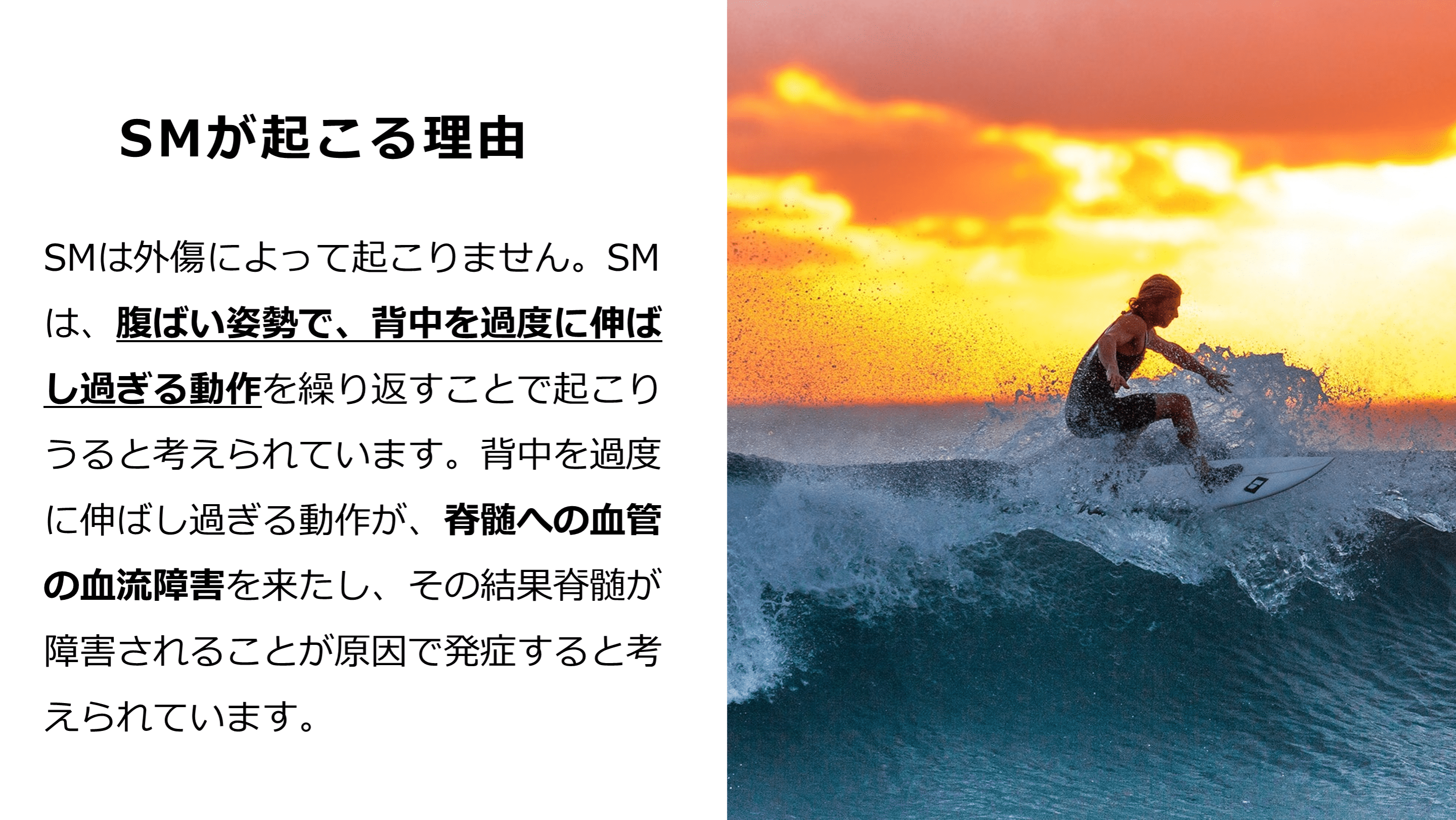 SMは起こりうるのか? サーフィンでおこりうるような、背骨を過度に伸ばすような動作で、サーフィン以外でもSMを発症することが知られています。