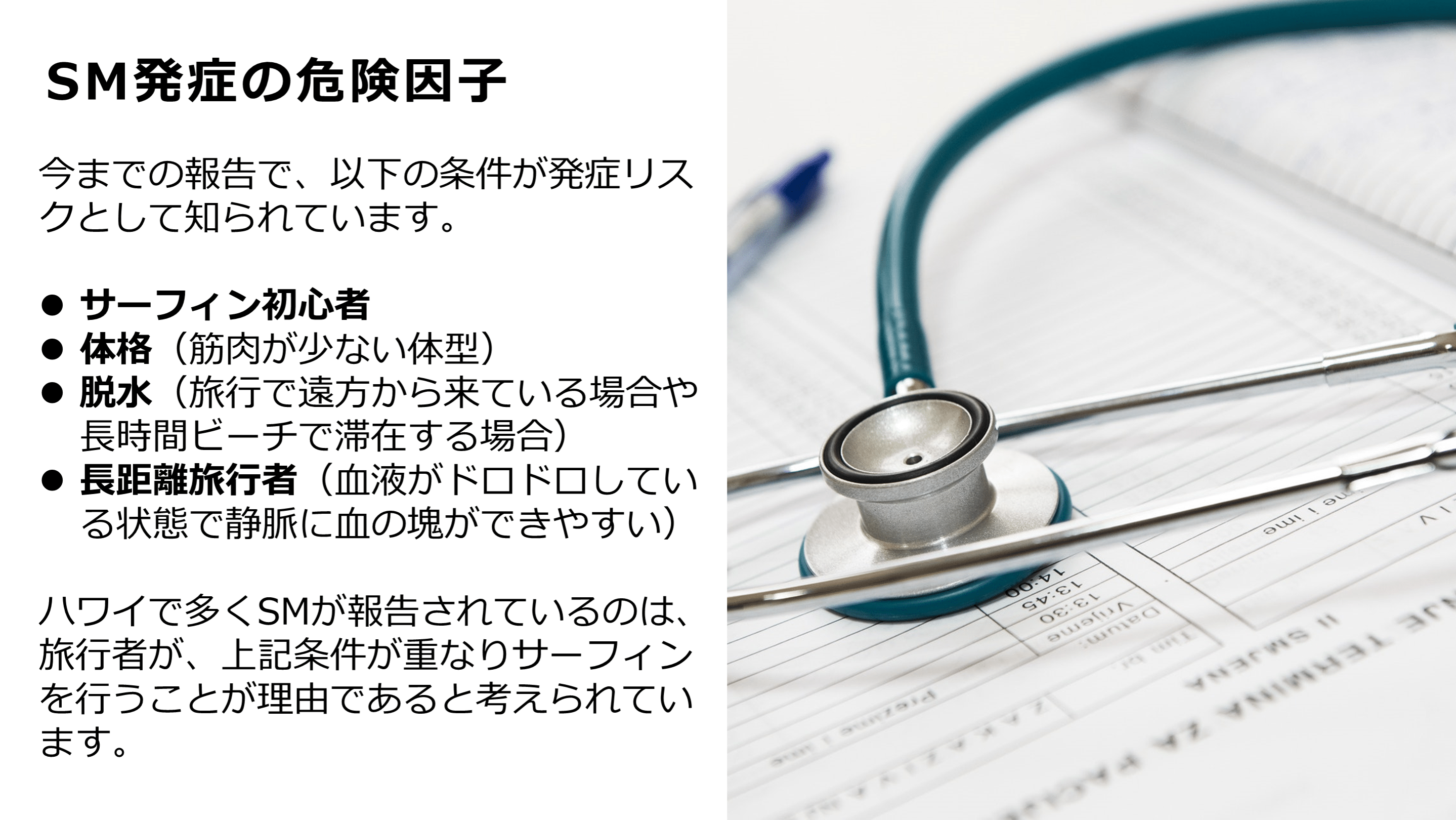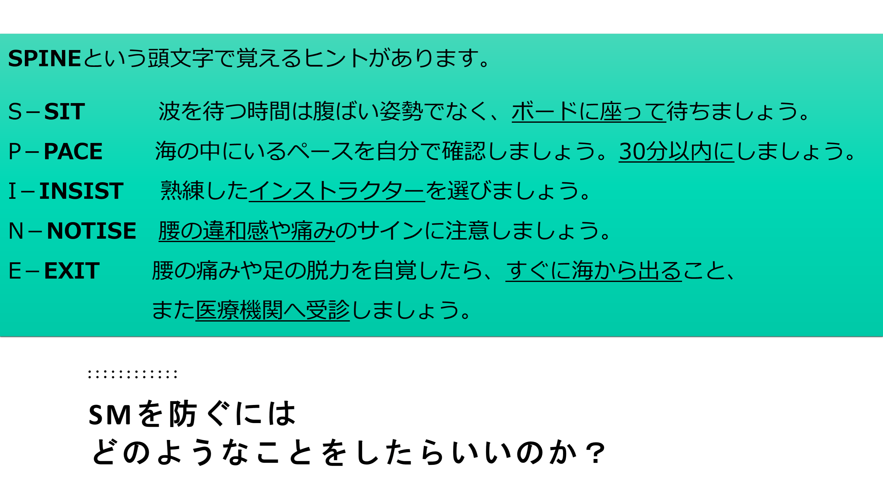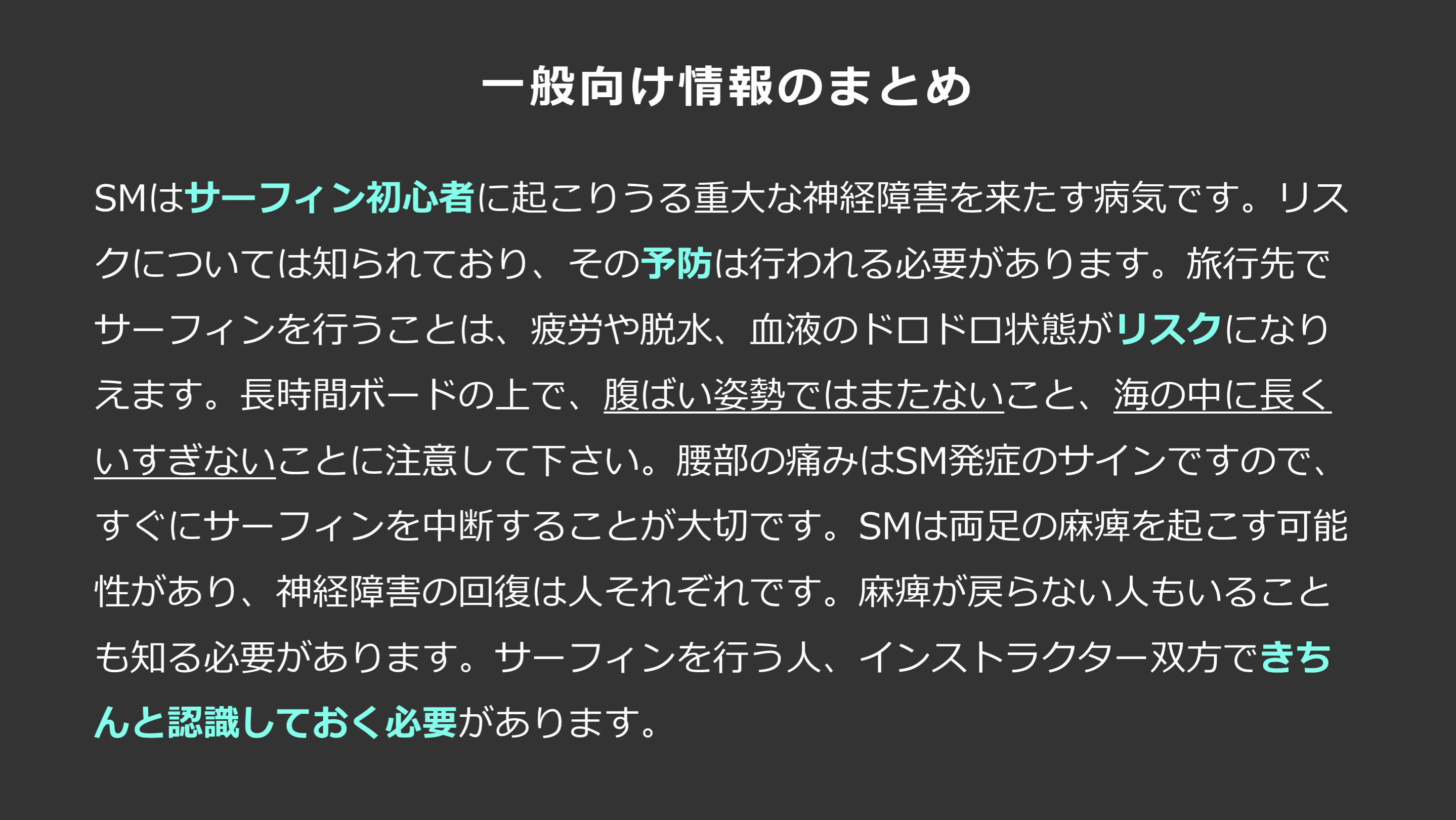 #13. 一般向け情報のまとめ SMはサーフィン初心者に起こりうる重大な神経障害を来たす病気です。リスクについては知られており、その予防は行われる必要があります。旅行先でサーフィンを行うことは、疲労や脱水、血液のドロドロ状態がリスクになりえます。長時間ボードの上で、腹ばい姿勢ではまたないこと、海の中に長くいすぎないことに注意して下さい。腰部の痛みはSM発症のサインですので、すぐにサーフィンを中断することが大切です。SMは両足の麻痺を起こす可能性があり、神経障害の回復は人それぞれです。麻痺が戻らない人もいることも知る必要があります。サーフィンを行う人、インストラクター双方できちんと認識しておく必要があります。