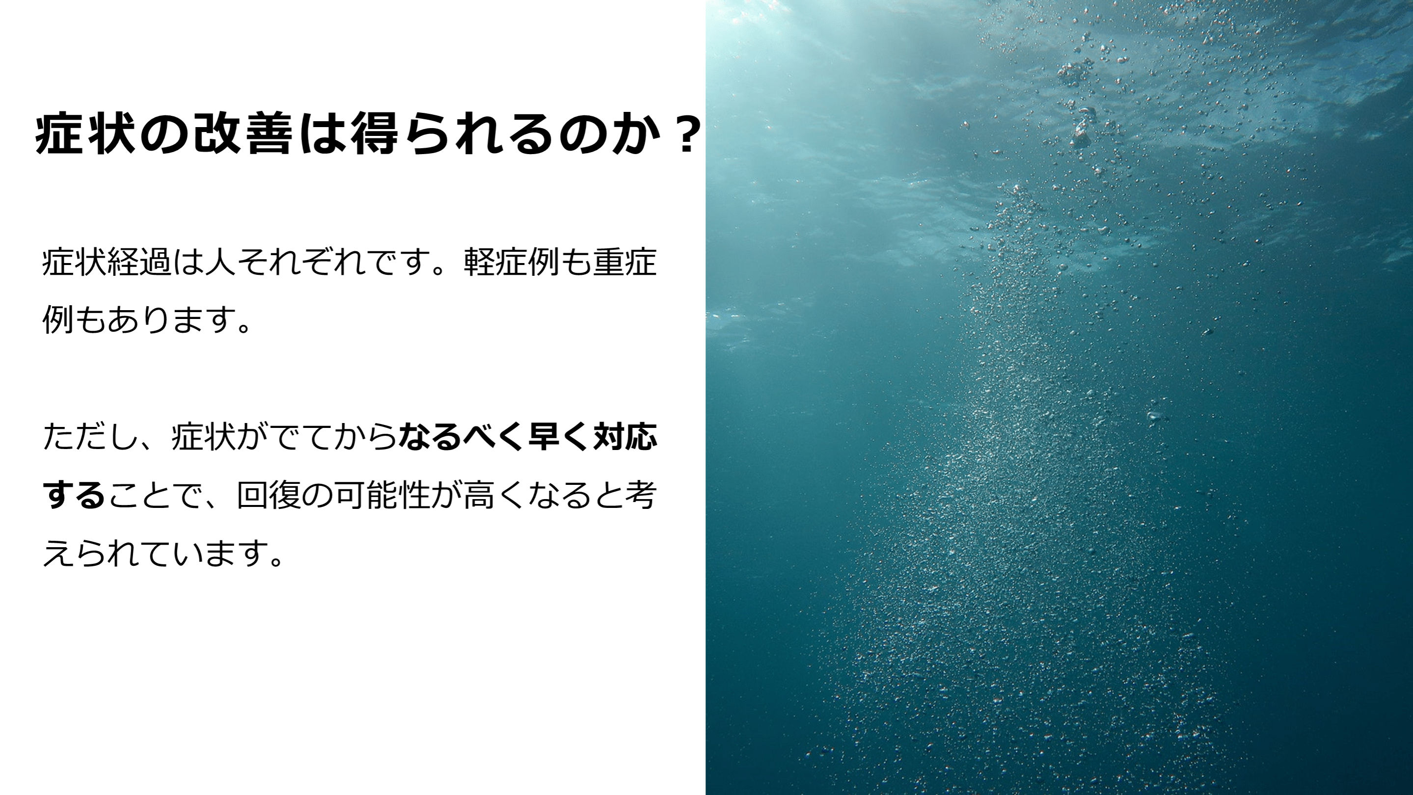 ただし、症状がでてからなるべく早く対応することで、回復の可能性が高くなると考えられています。