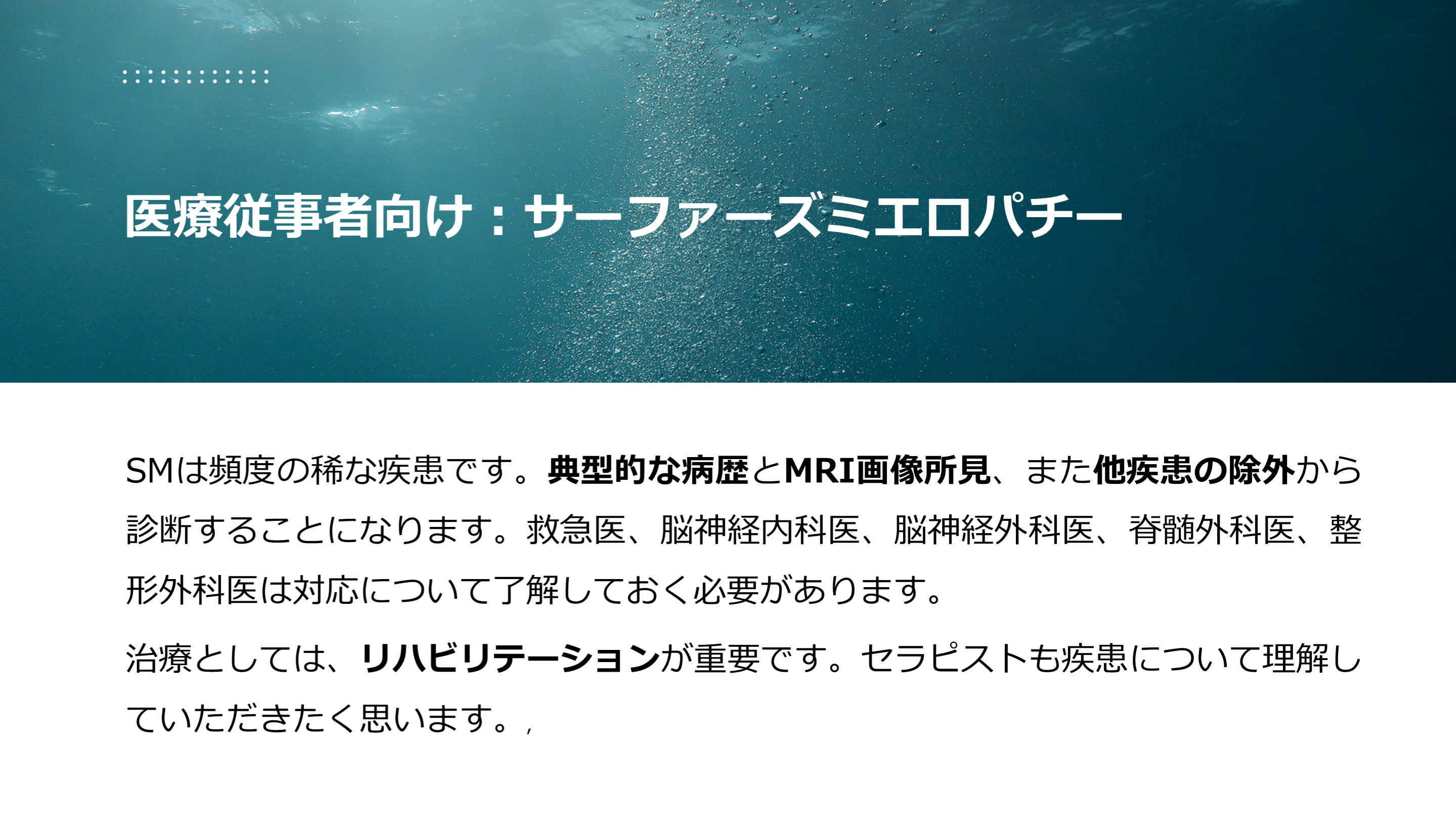 治療としては、リハビリテーションが重要です。セラピストも疾患について理解していただきたく思います。, 医療従事者向け:サーファーズミエロパチー