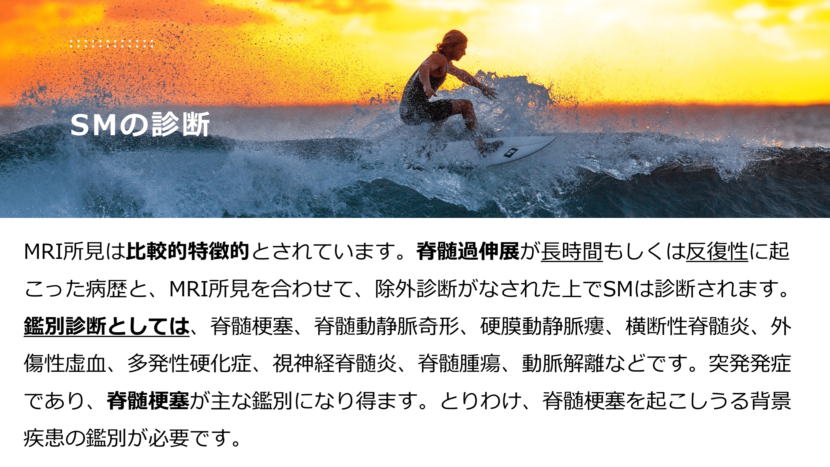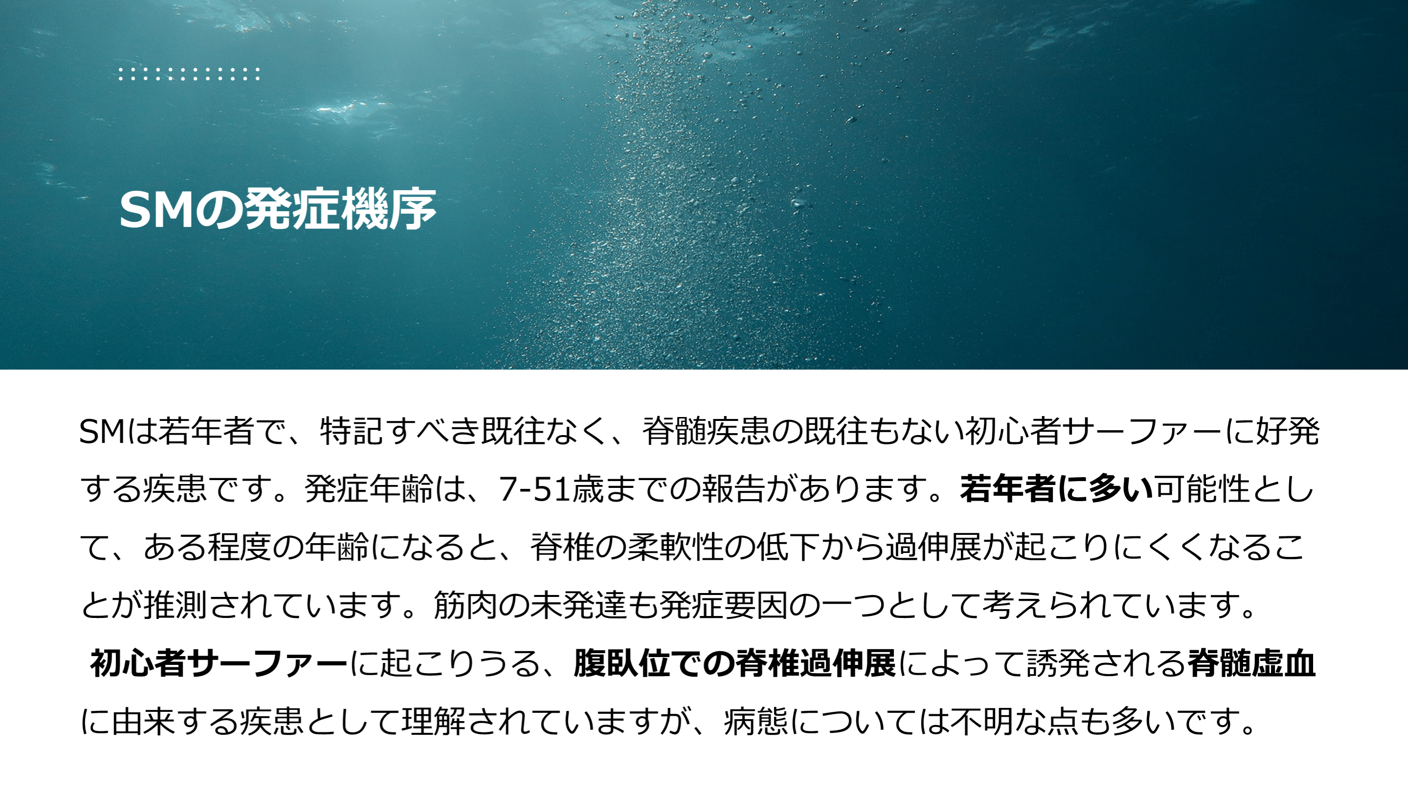 初心者サーファーに起こりうる、腹臥位での脊椎過伸展によって誘発される脊髄虚血に由来する疾患として理解されていますが、病態については不明な点も多いです。 SMの発症機序