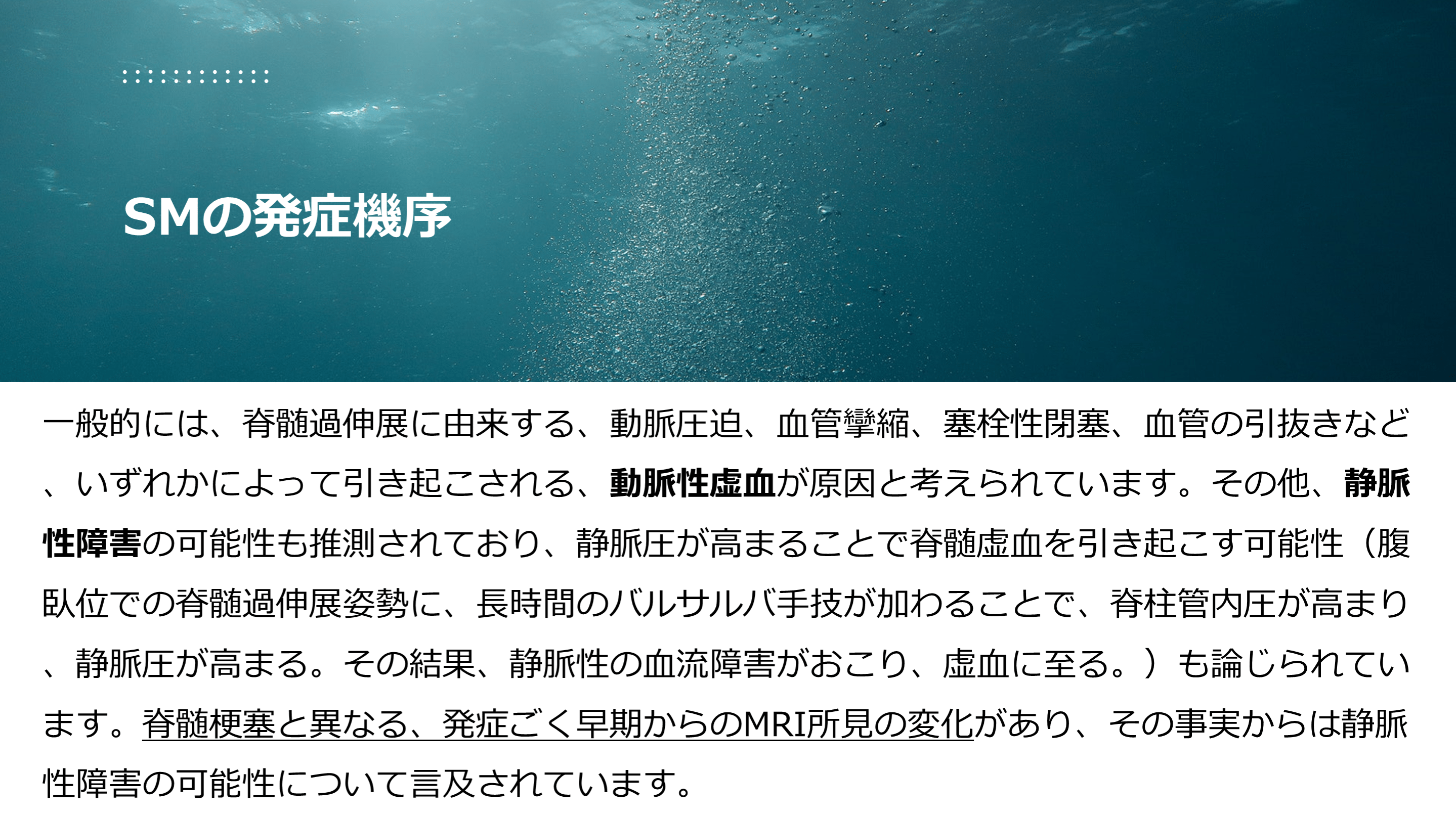 #7. SMが起こる理由 SMは外傷によって起こりません。SMは、腹ばい姿勢で、背中を過度に伸ばし過ぎる動作を繰り返すことで起こりうると考えられています。背中を過度に伸ばし過ぎる動作が、脊髄への血管の血流障害を来たし、その結果脊髄が障害されることが原因で発症すると考えられています。