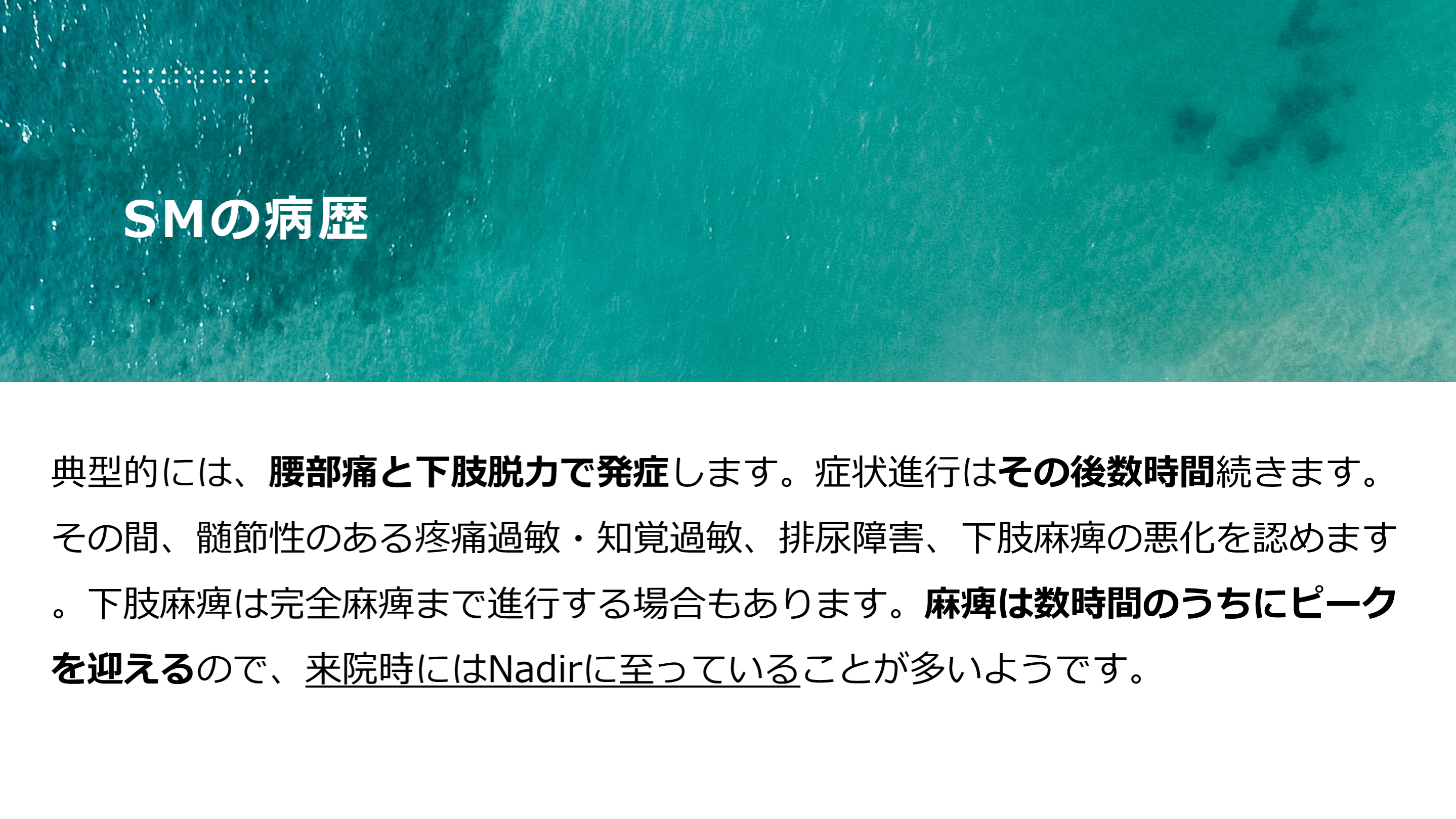 #18. SMの病歴 典型的には、腰部痛と下肢脱力で発症します。症状進行はその後数時間続きます。その間、髄節性のある疼痛過敏・知覚過敏、排尿障害、下肢麻痺の悪化を認めます。下肢麻痺は完全麻痺まで進行する場合もあります。麻痺は数時間のうちにピークを迎えるので、来院時にはNadirに至っていることが多いようです。