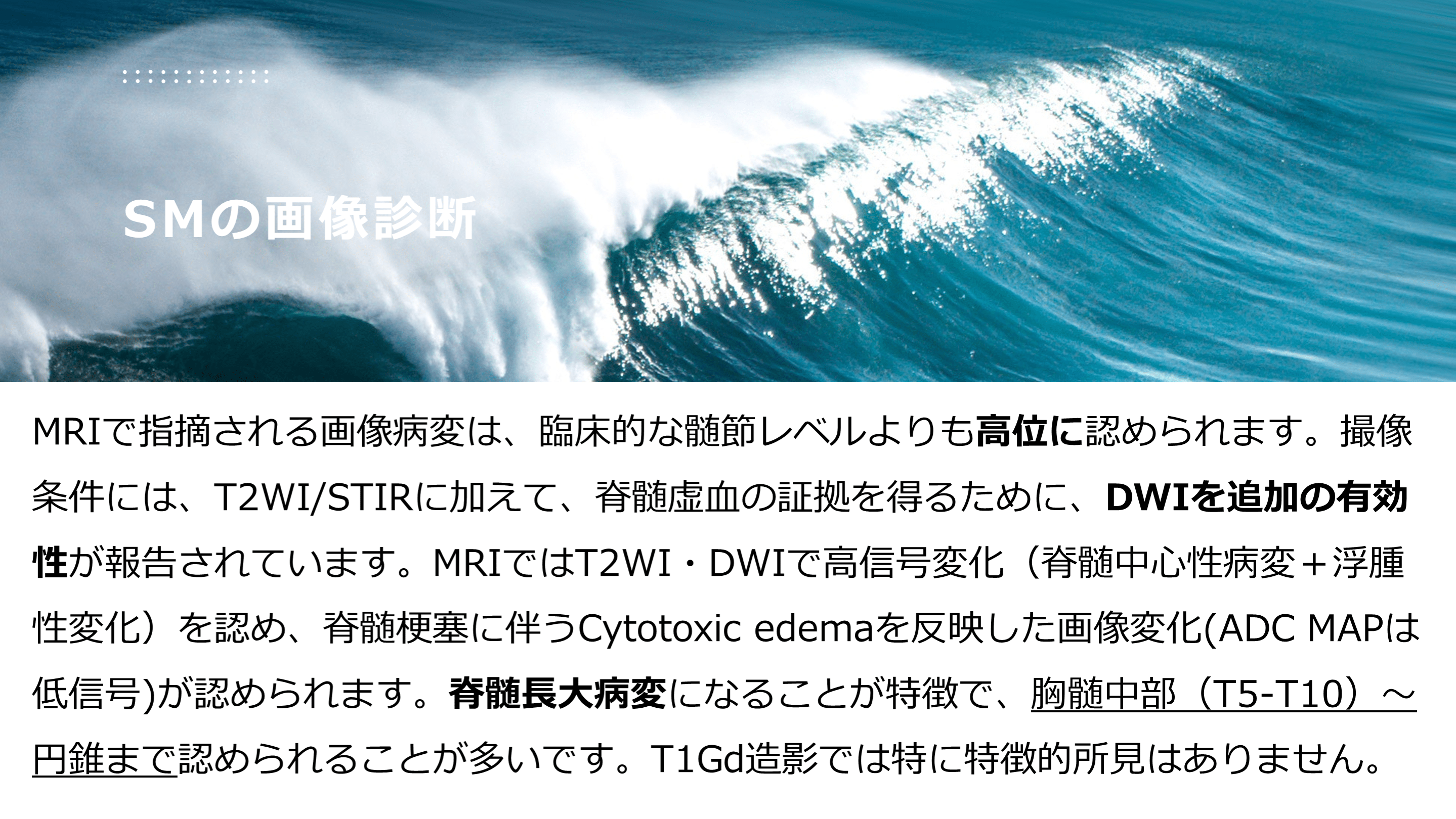 #19. SMの画像診断 MRIで指摘される画像病変は、臨床的な髄節レベルよりも高位に認められます。撮像条件には、T2WI/STIRに加えて、脊髄虚血の証拠を得るために、DWIを追加の有効性が報告されています。MRIではT2WI・DWIで高信号変化(脊髄中心性病変+浮腫性変化)を認め、脊髄梗塞に伴うCytotoxic edemaを反映した画像変化(ADC MAPは低信号)が認められます。脊髄長大病変になることが特徴で、胸髄中部(T5-T10)~円錐まで認められることが多いです。T1Gd造影では特に特徴的所見はありません。