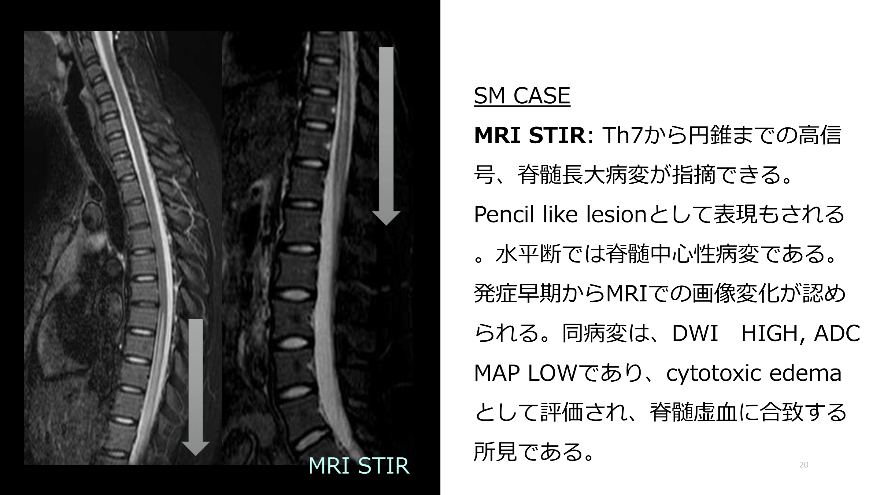 MRI STIR: Th7から円錐までの高信号、脊髄長大病変が指摘できる。Pencil like lesionとして表現もされる。水平断では脊髄中心性病変である。発症早期からMRIでの画像変化が認められる。同病変は、DWI HIGH, ADC MAP LOWであり、cytotoxic edemaとして評価され、脊髄虚血に合致する所見である。 MRI STIR