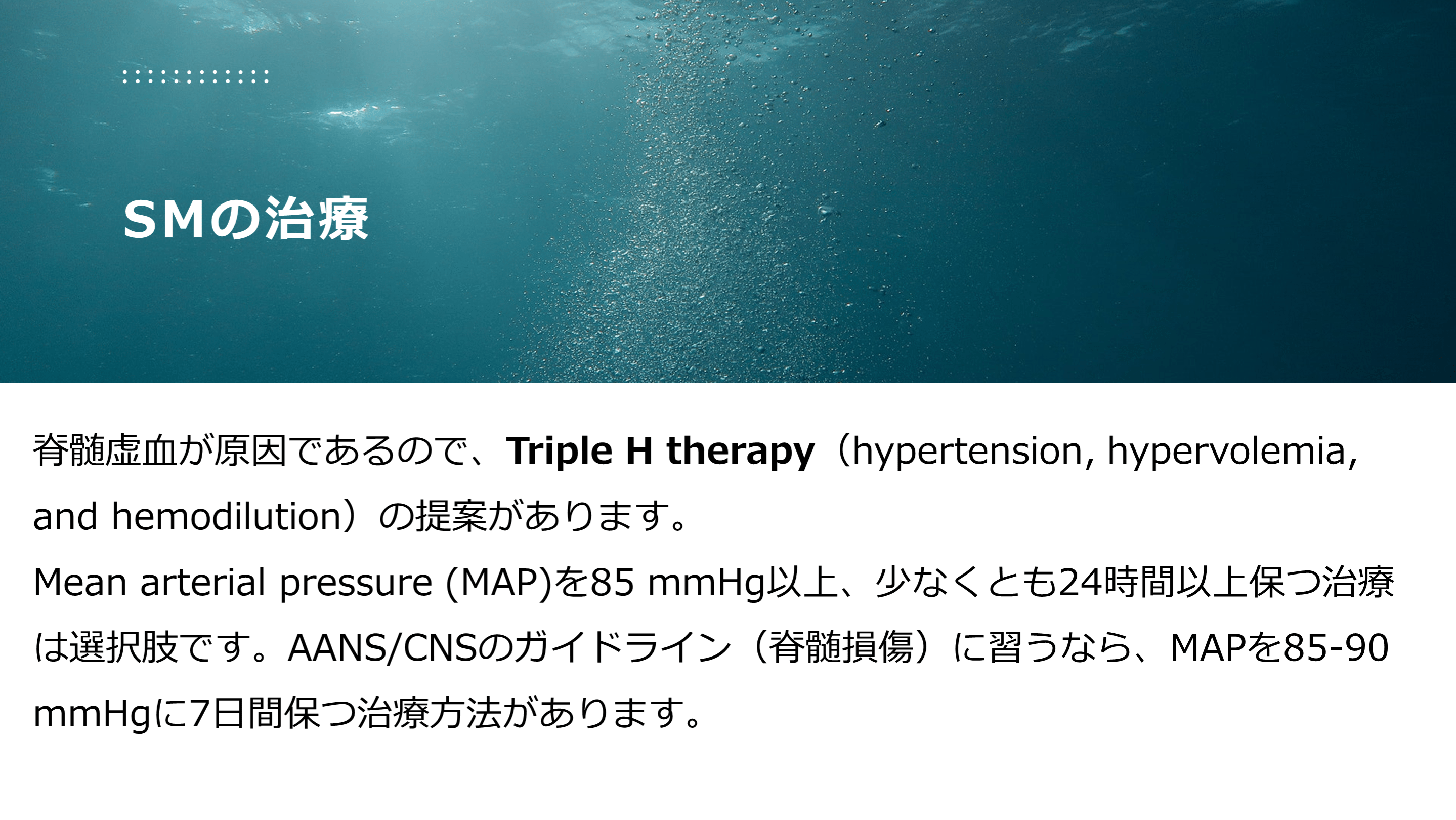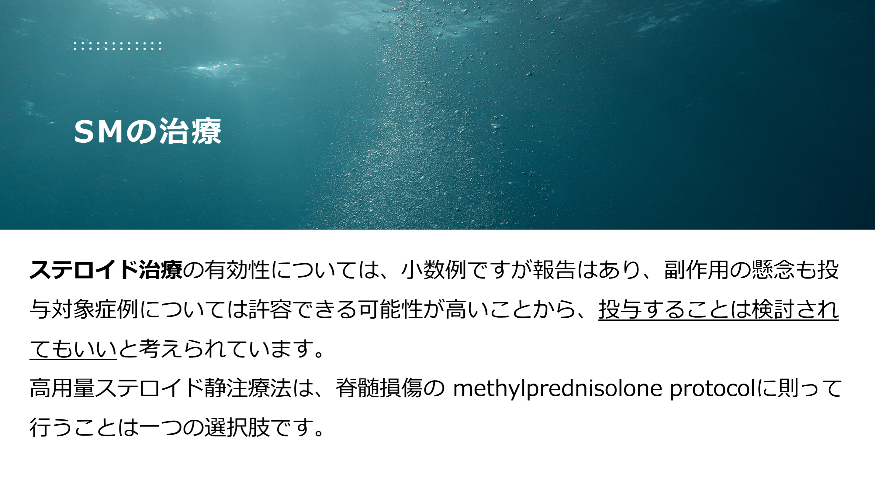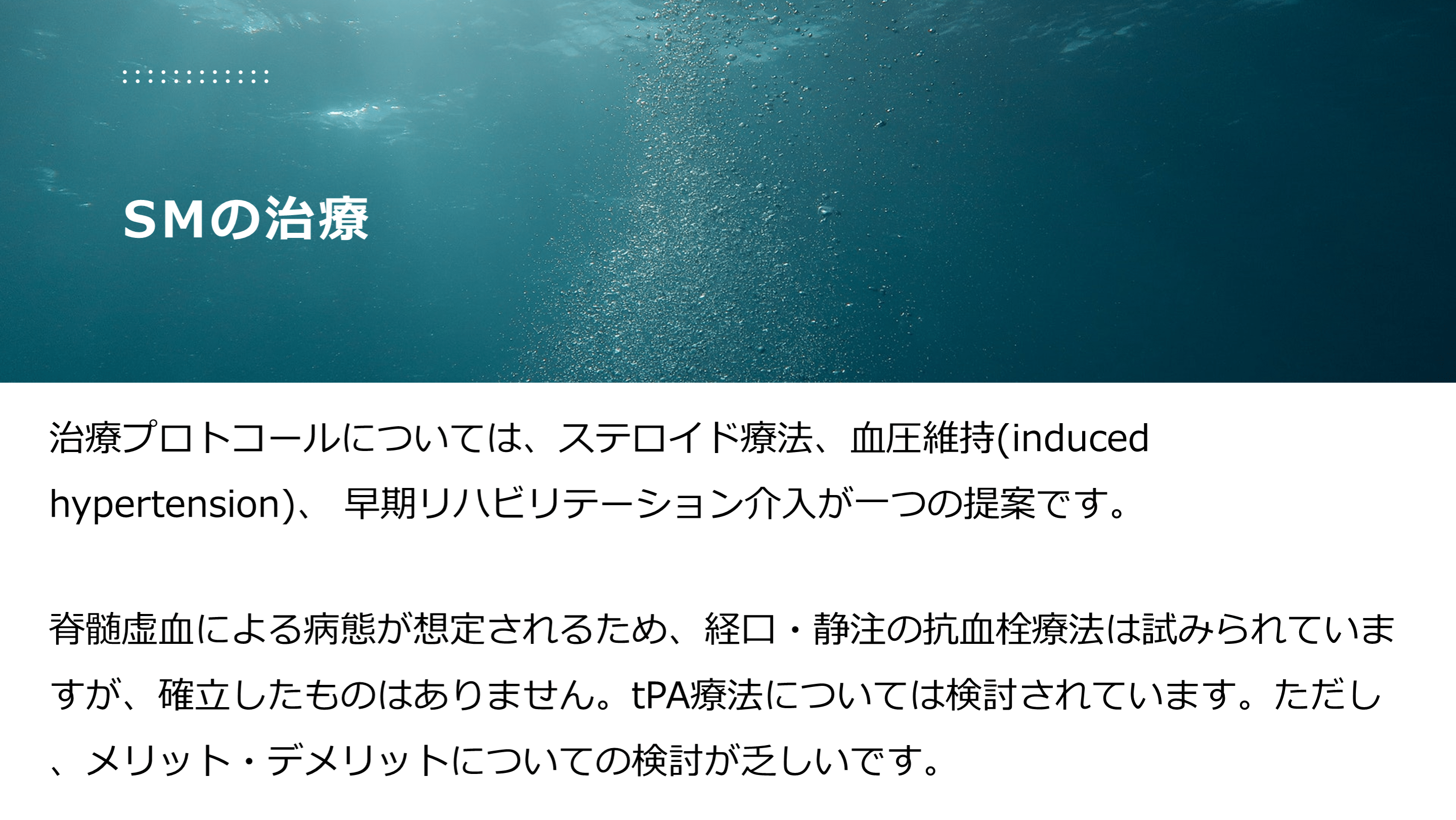 #23. SMの治療 治療プロトコールについては、ステロイド療法、血圧維持(induced hypertension)、 早期リハビリテーション介入が一つの提案です。