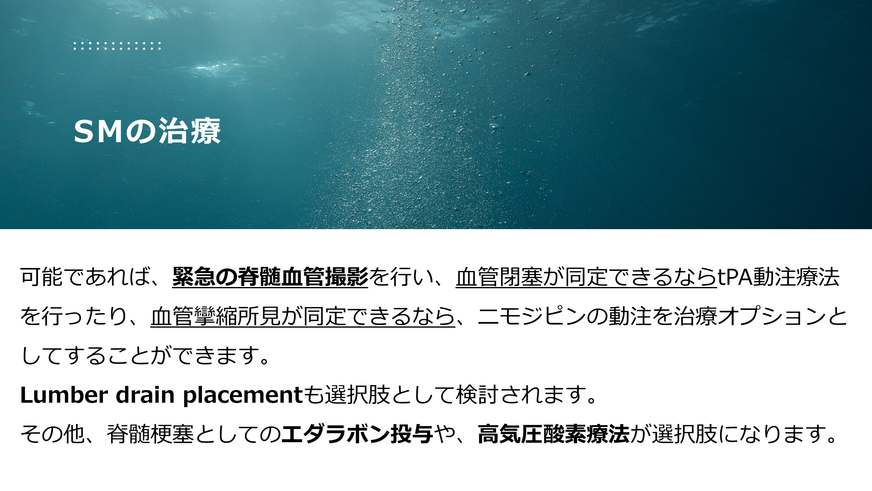 #26. SMの治療 可能であれば、緊急の脊髄血管撮影を行い、血管閉塞が同定できるならtPA動注療法を行ったり、血管攣縮所見が同定できるなら、ニモジピンの動注を治療オプションとしてすることができます。
