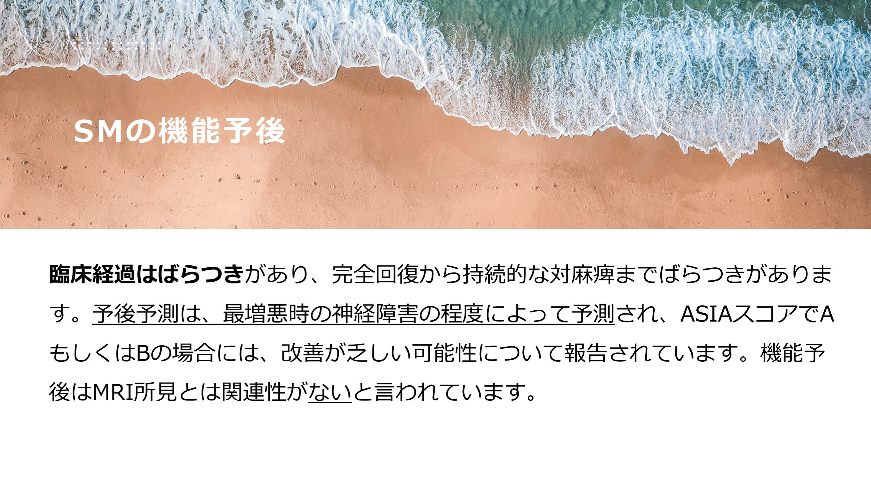 #27. SMの機能予後 臨床経過はばらつきがあり、完全回復から持続的な対麻痺までばらつきがあります。予後予測は、最増悪時の神経障害の程度によって予測され、ASIAスコアでAもしくはBの場合には、改善が乏しい可能性について報告されています。機能予後はMRI所見とは関連性がないと言われています。