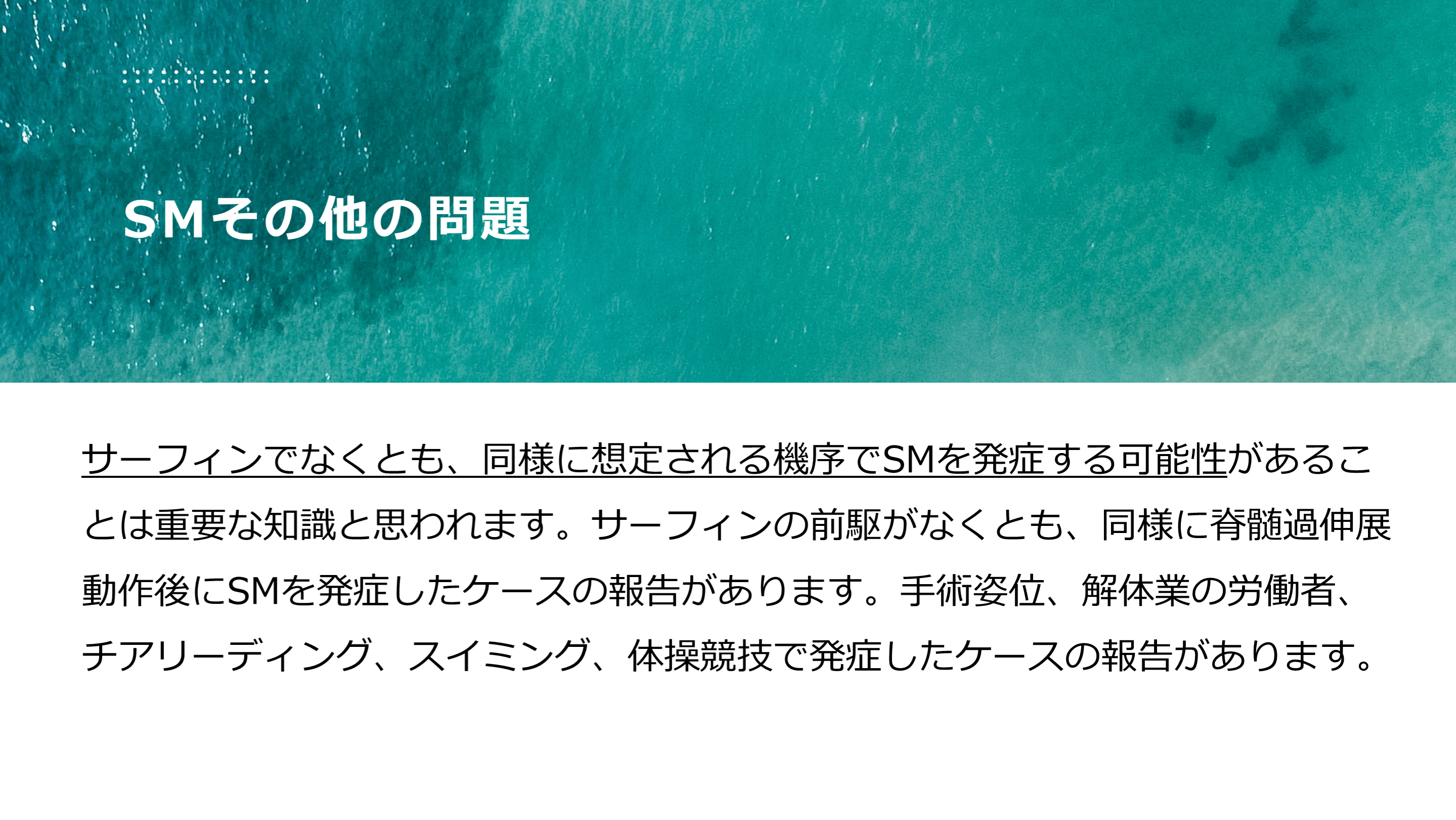 #28. SMその他の問題 サーフィンでなくとも、同様に想定される機序でSMを発症する可能性があることは重要な知識と思われます。サーフィンの前駆がなくとも、同様に脊髄過伸展動作後にSMを発症したケースの報告があります。手術姿位、解体業の労働者、チアリーディング、スイミング、体操競技で発症したケースの報告があります。