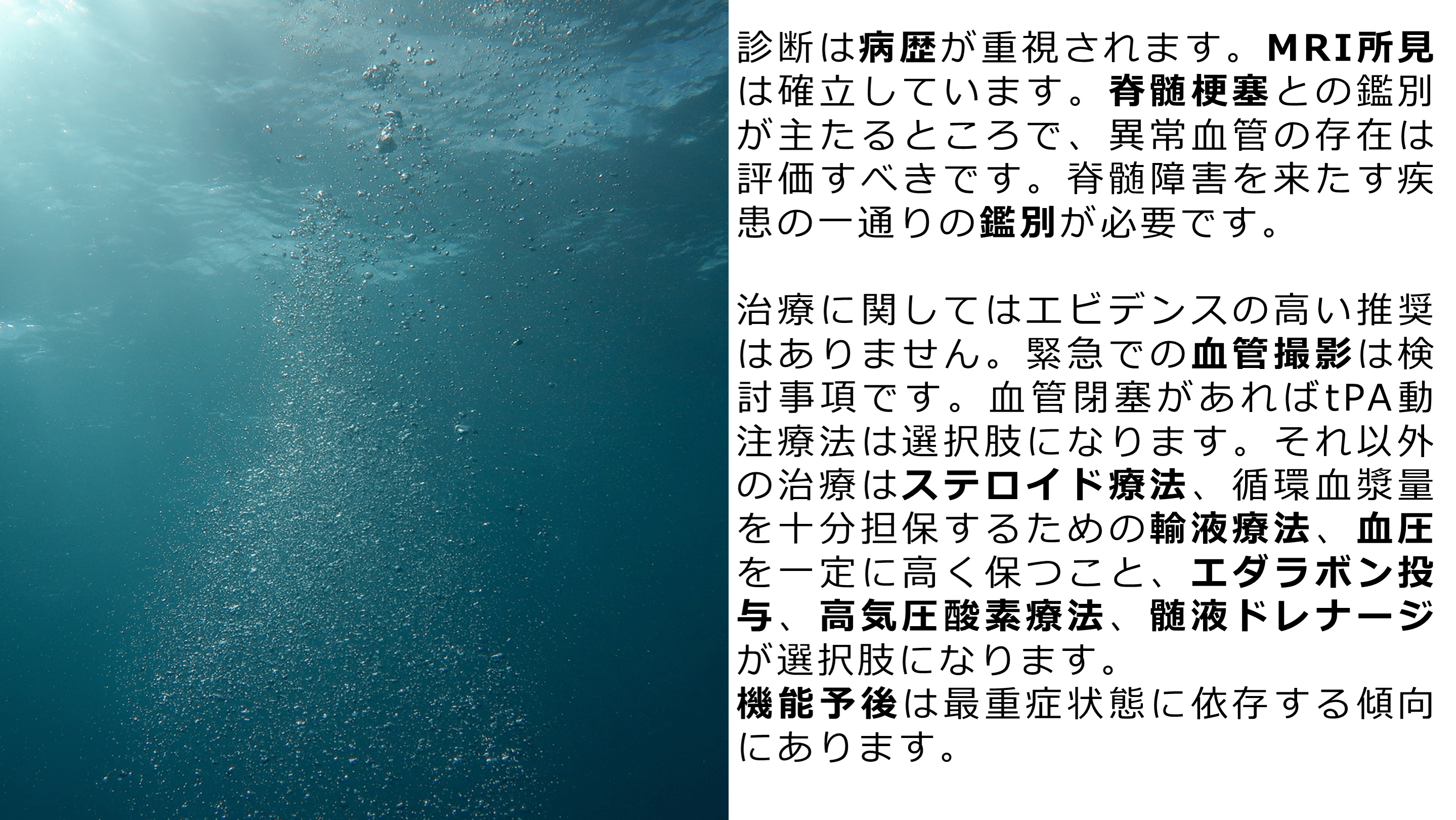 治療に関してはエビデンスの高い推奨はありません。緊急での血管撮影は検討事項です。血管閉塞があればtPA動注療法は選択肢になります。それ以外の治療はステロイド療法、循環血漿量を十分担保するための輸液療法、血圧を一定に高く保つこと、エダラボン投与、高気圧酸素療法、髄液ドレナージが選択肢になります。