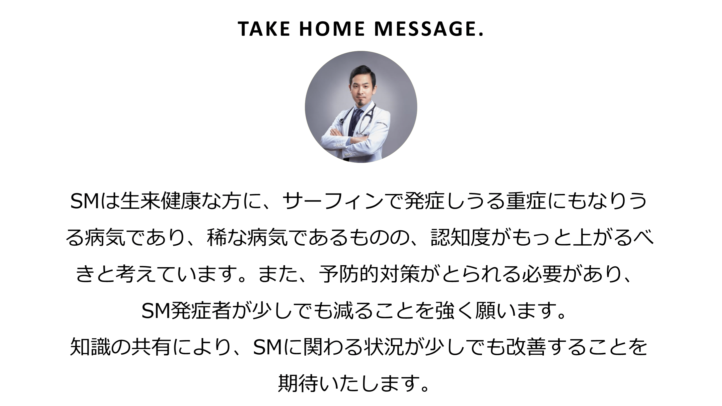 知識の共有により、SMに関わる状況が少しでも改善することを期待いたします。 TAKE HOME MESSAGE.