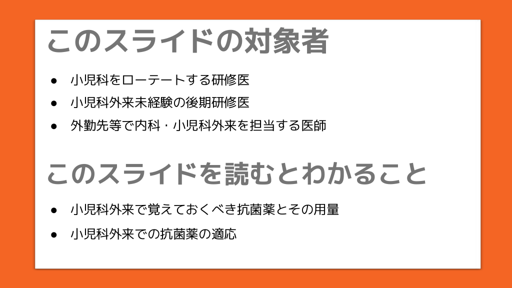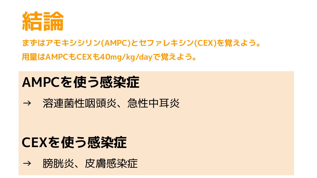小児科外来で覚えておくべき抗菌薬とその容量、適応について、AMPCとCEX使う感染症を中心に解説します。小児科をローテートする研修医、小児科外来未経験の後期研修医、外勤先等で内科・小児科外来を担当する先生のお役に立てればと思います。