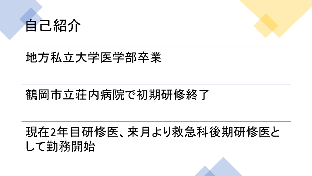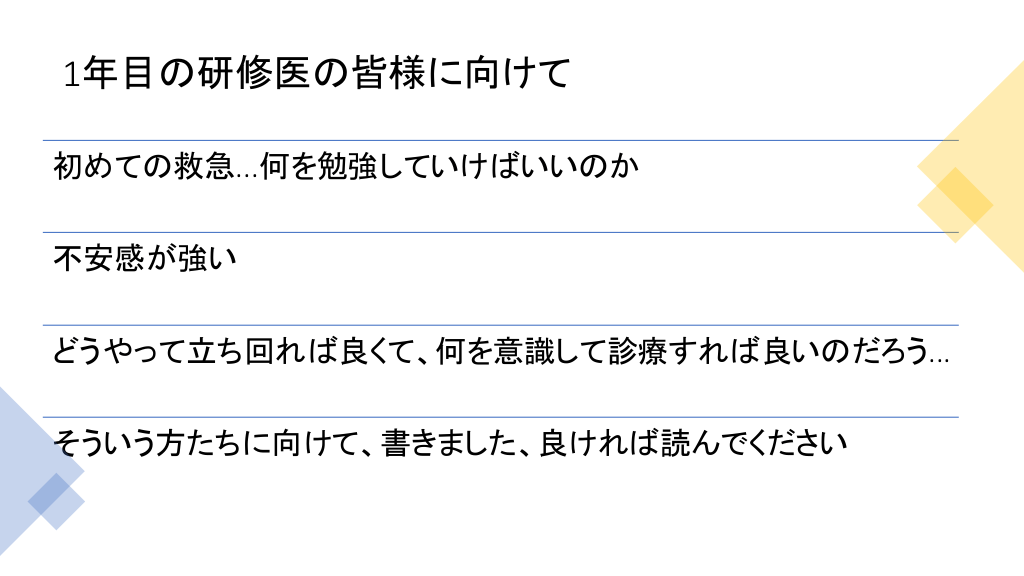 当院の1年目研修医向けに作ったものであり、内容は全く難しいものではありません。