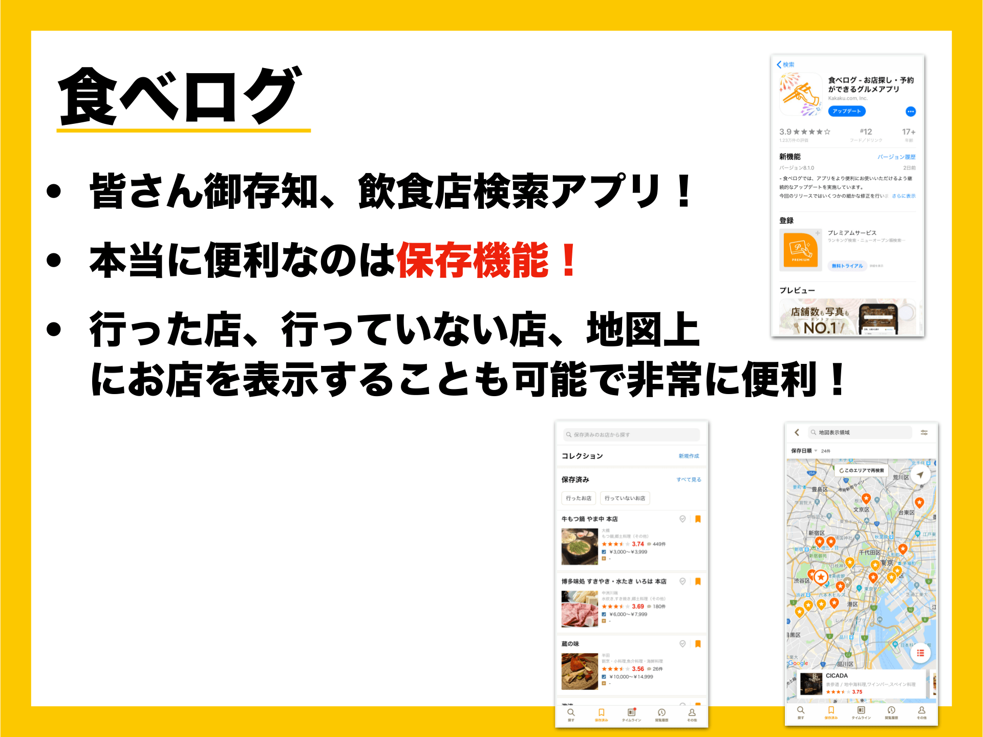 #13. 食べログ • • • 皆さん御存知、飲食店検索アプリ! 本当に便利なのは保存機能! 行った店、行っていない店、地図上