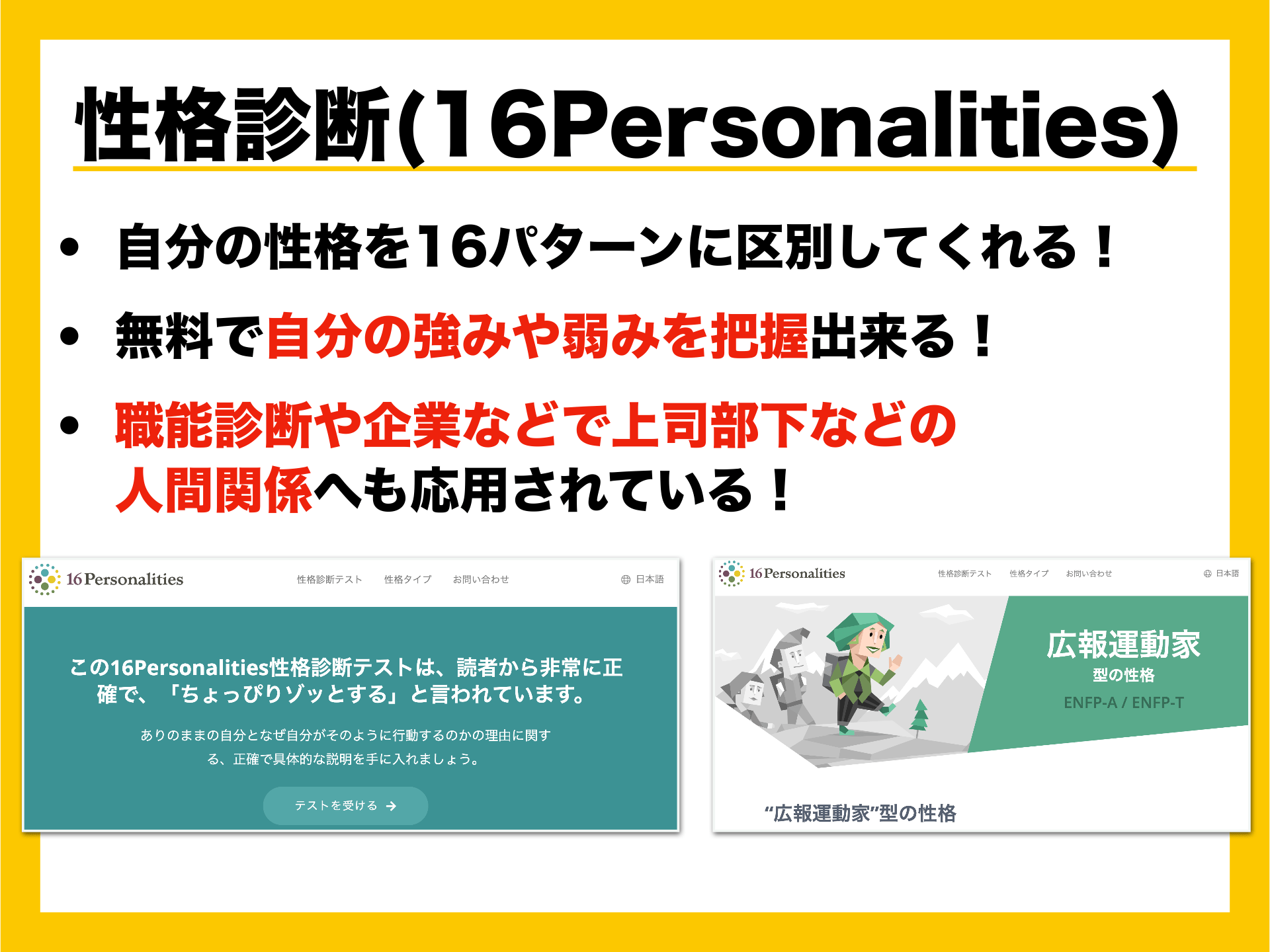 #15. 性格診断(16Personalities) • • • 自分の性格を16パターンに区別してくれる! 無料で自分の強みや弱みを把握出来る! 職能診断や企業などで上司部下などの