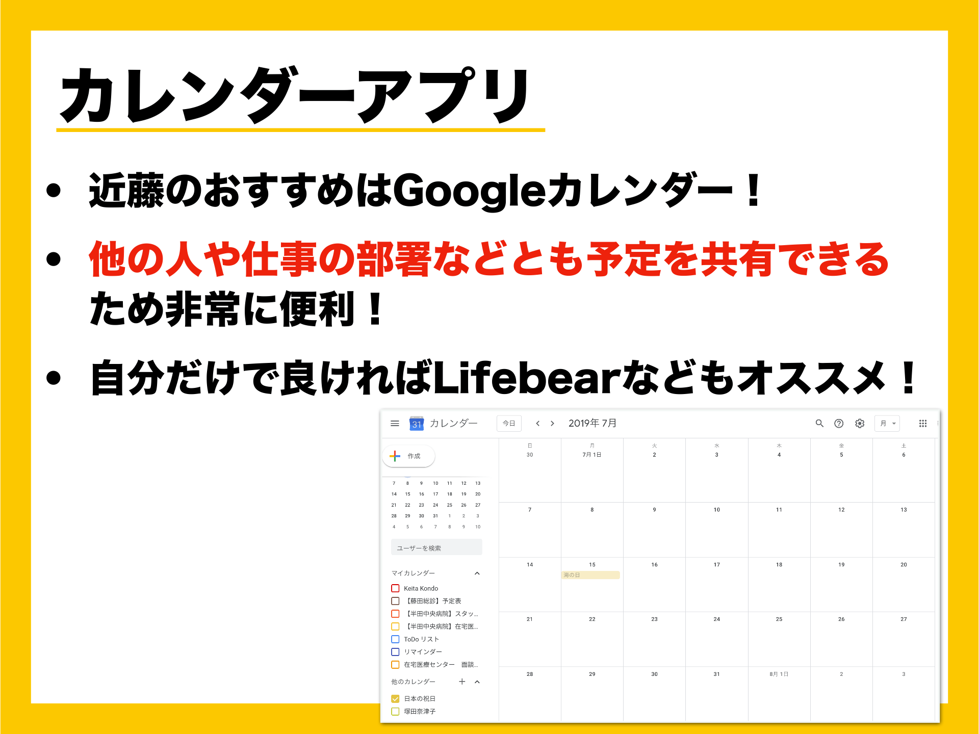 #17. カレンダーアプリ • • • 近藤のおすすめはGoogleカレンダー! 他の人や仕事の部署などとも予定を共有できる