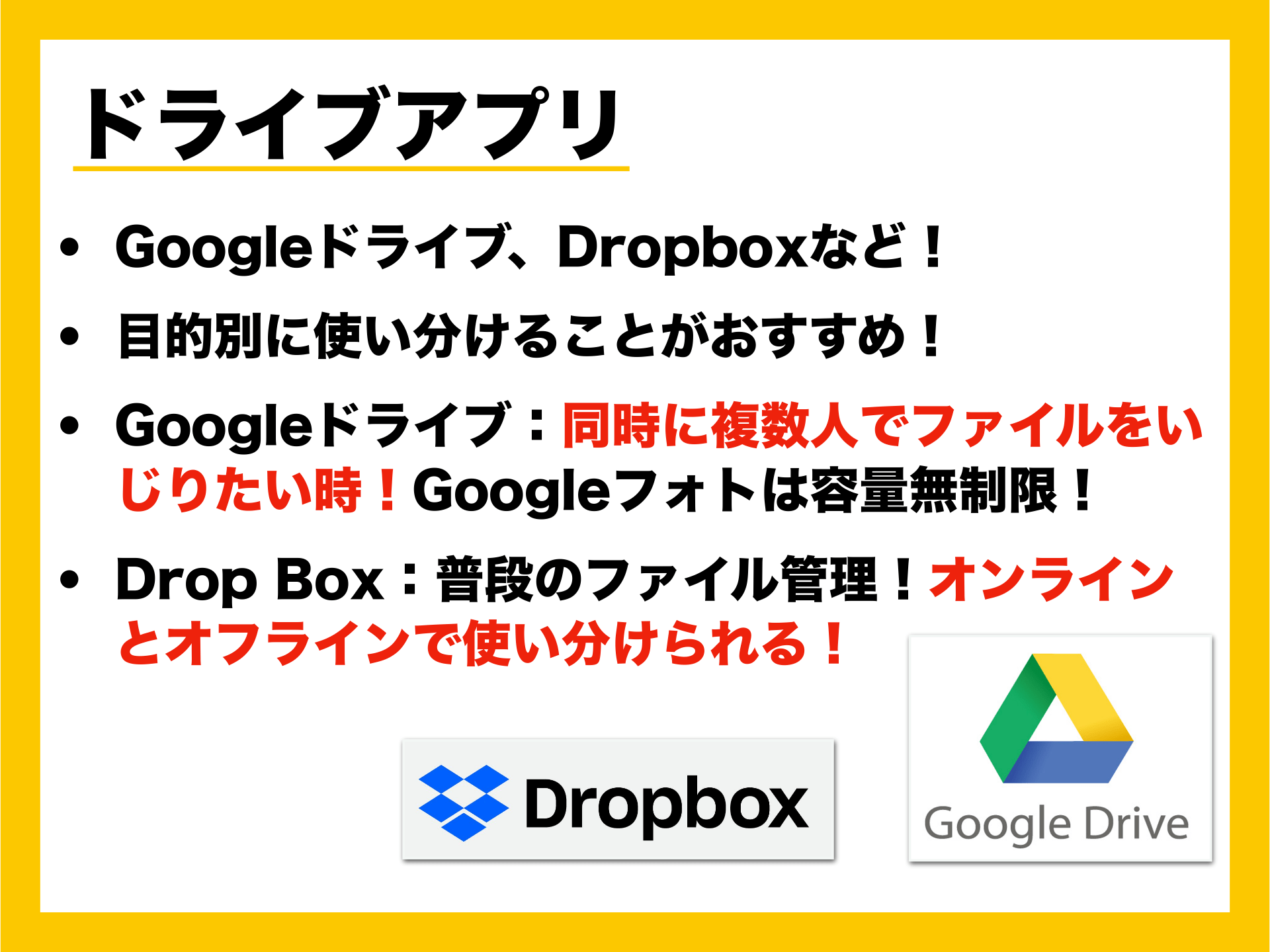 #18. ドライブアプリ • • • • Googleドライブ、Dropboxなど! 目的別に使い分けることがおすすめ! Googleドライブ:同時に複数人でファイルをい じりたい時!Googleフォトは容量無制限! Drop Box:普段のファイル管理!オンライン とオフラインで使い分けられる! Copyright FUJITA SOUSHIN PROGAM All Right Reserved.