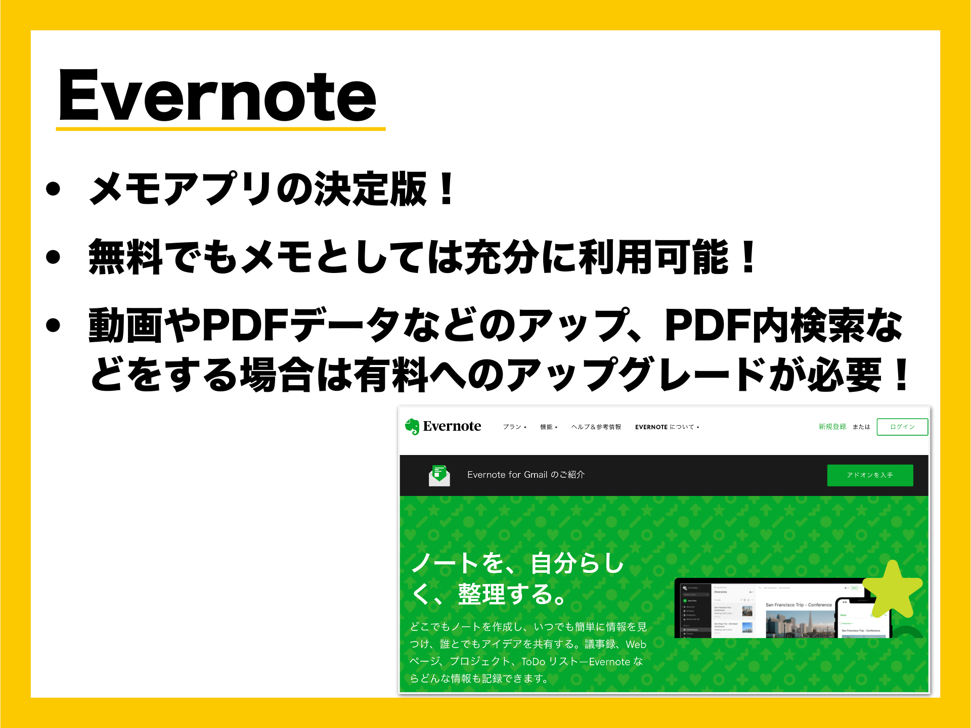 #19. Evernote • • • メモアプリの決定版! 無料でもメモとしては充分に利用可能! 動画やPDFデータなどのアップ、PDF内検索な どをする場合は有料へのアップグレードが必要! Copyright FUJITA SOUSHIN PROGAM All Right Reserved.