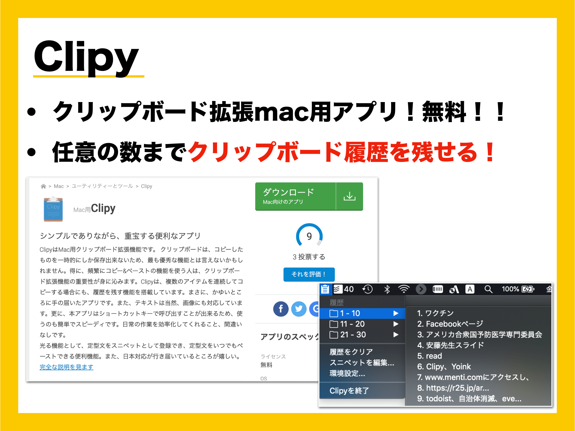 #25. Clipy • • クリップボード拡張mac用アプリ!無料!! 任意の数までクリップボード履歴を残せる! Copyright FUJITA SOUSHIN PROGAM All Right Reserved.
