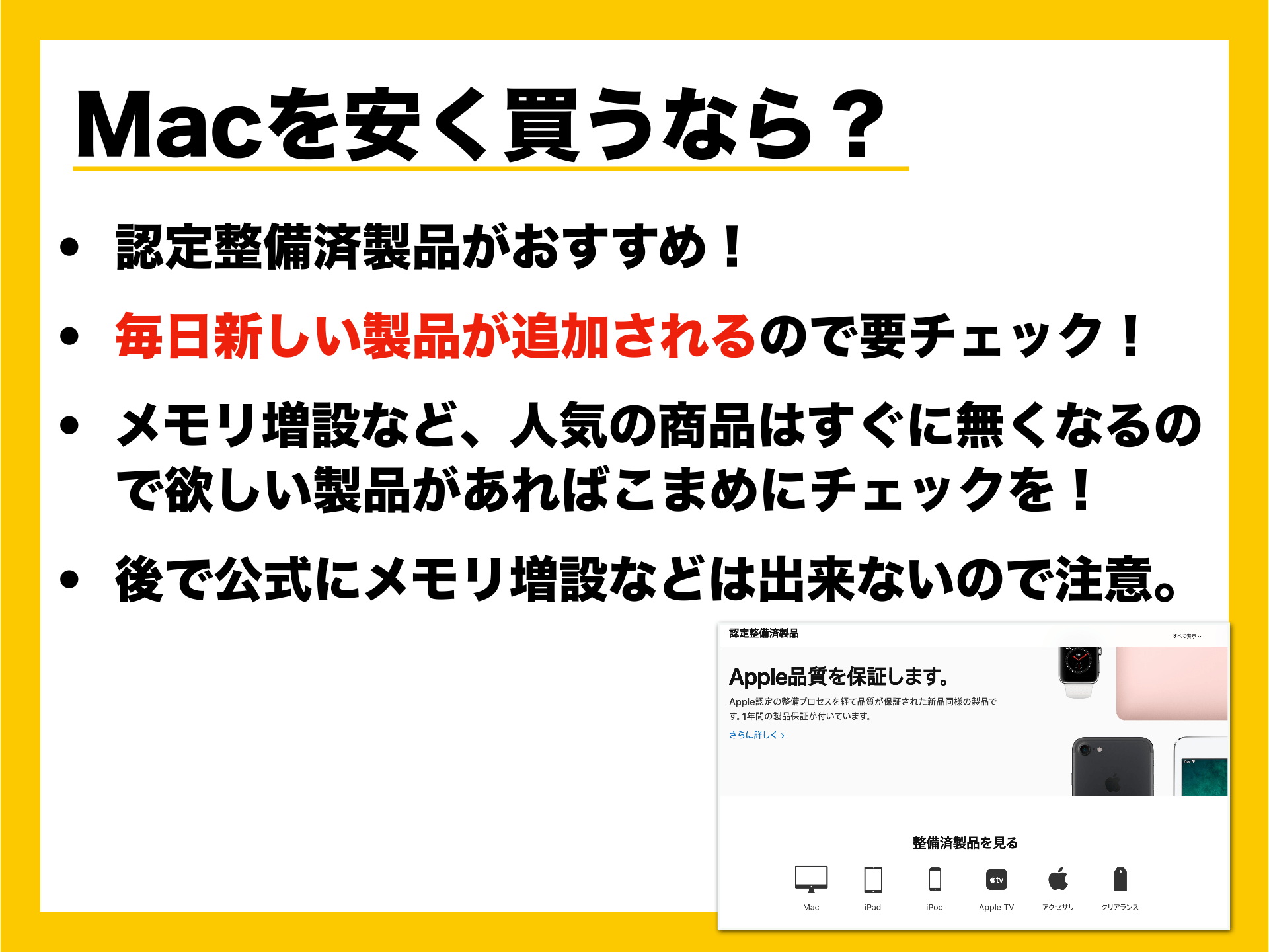 #27. Macを安く買うなら? • • • • 認定整備済製品がおすすめ! 毎日新しい製品が追加されるので要チェック! メモリ増設など、人気の商品はすぐに無くなるの で欲しい製品があればこまめにチェックを! 後で公式にメモリ増設などは出来ないので注意。 Copyright FUJITA SOUSHIN PROGAM All Right Reserved.