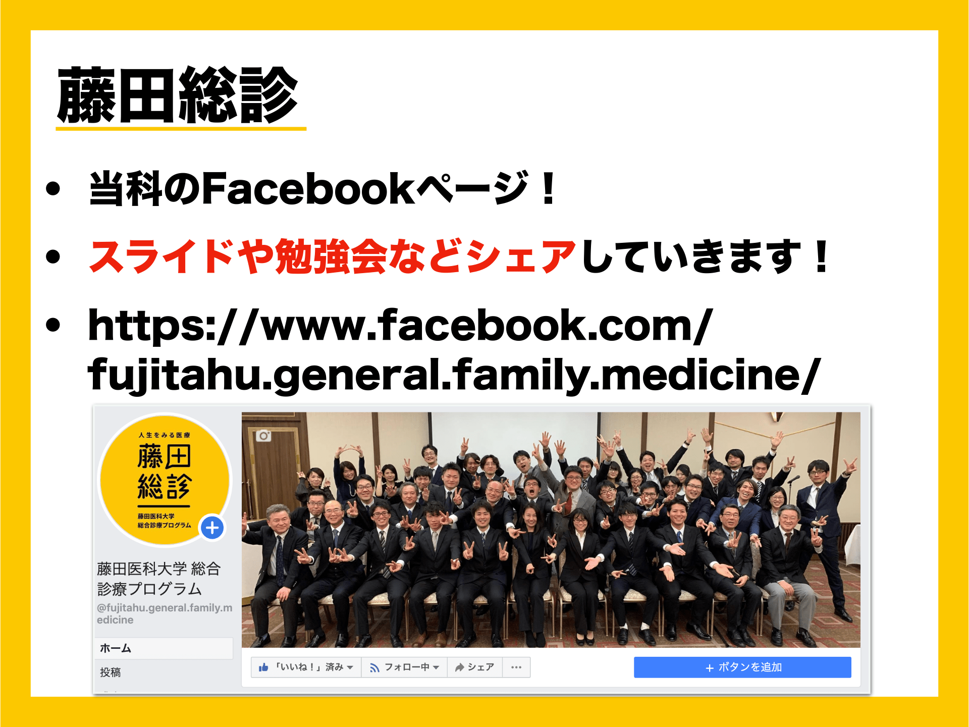 #29. 藤田総診 • • • 当科のFacebookページ! スライドや勉強会などシェアしていきます! https://www.facebook.com/ fujitahu.general.family.medicine/ Copyright FUJITA SOUSHIN PROGAM All Right Reserved.