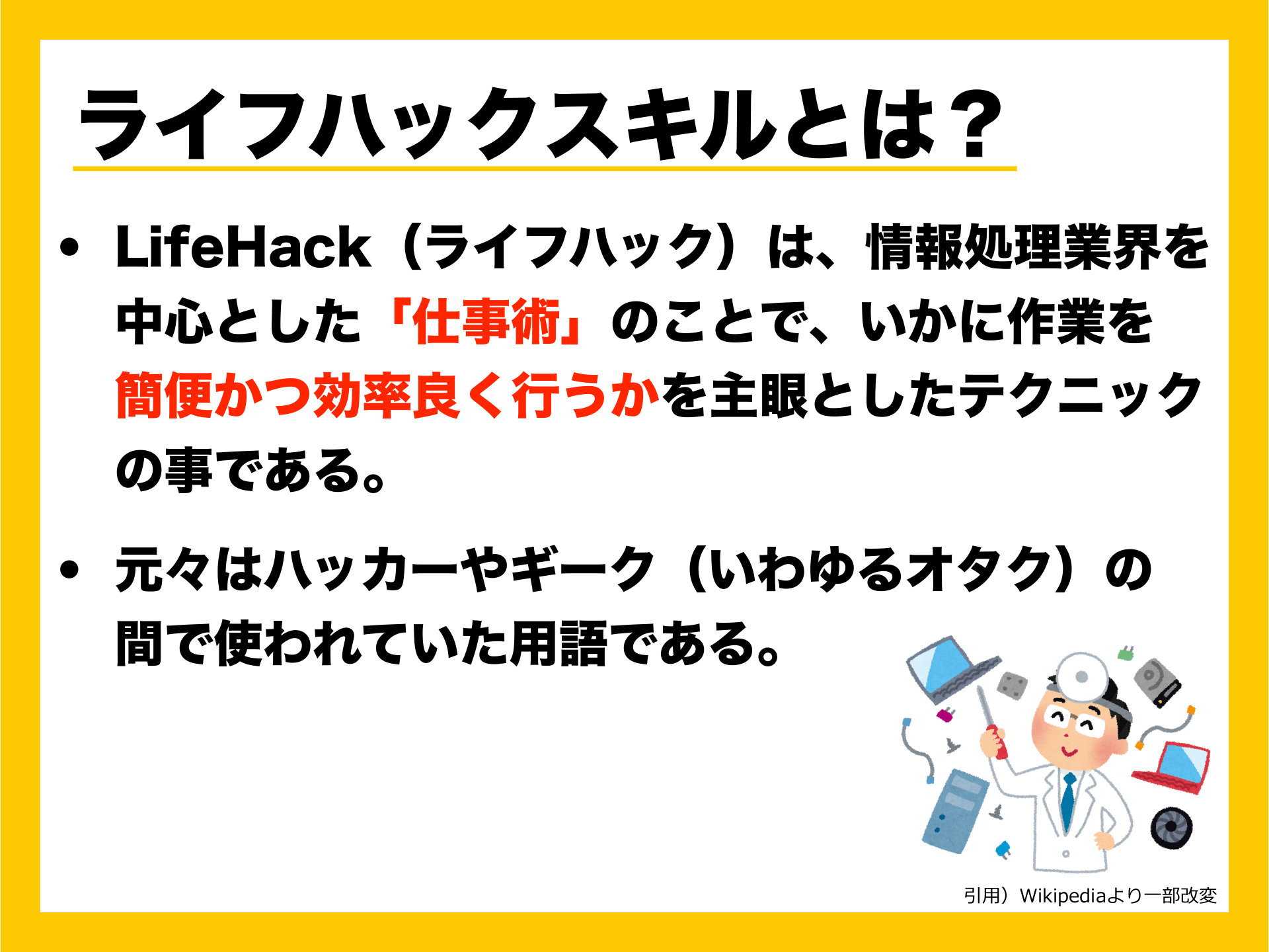 #3. ライフハックスキルとは? • • LifeHack(ライフハック)は、情報処理業界を 中心とした「仕事術」のことで、いかに作業を