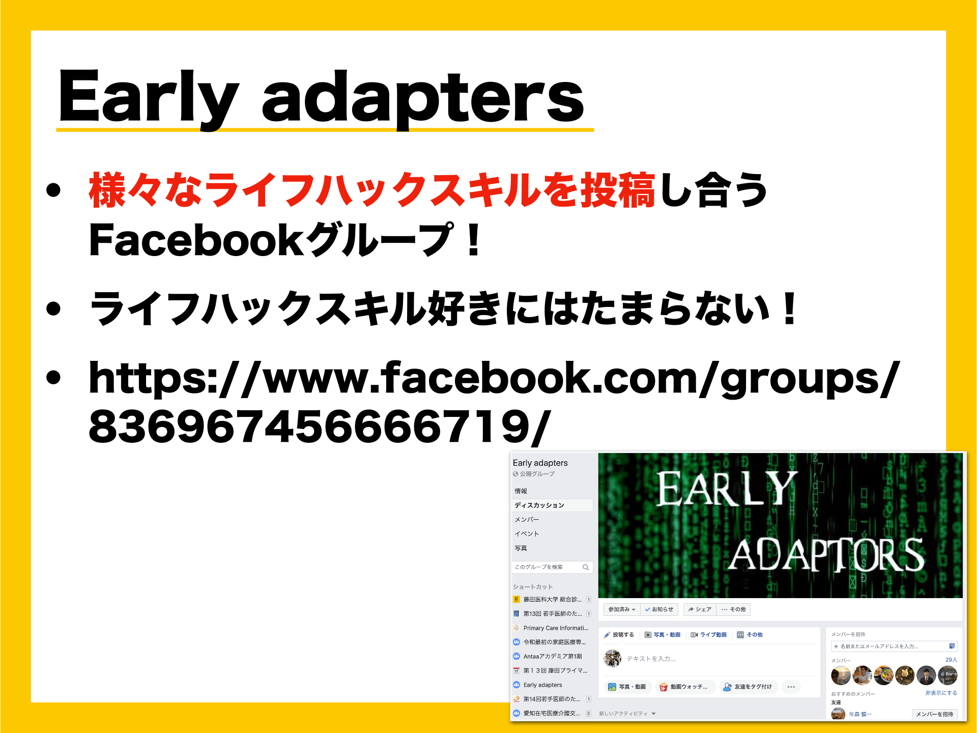 #32. Early adapters • • • 様々なライフハックスキルを投稿し合う Facebookグループ! ライフハックスキル好きにはたまらない! https://www.facebook.com/groups/ 836967456666719/ Copyright FUJITA SOUSHIN PROGAM All Right Reserved.