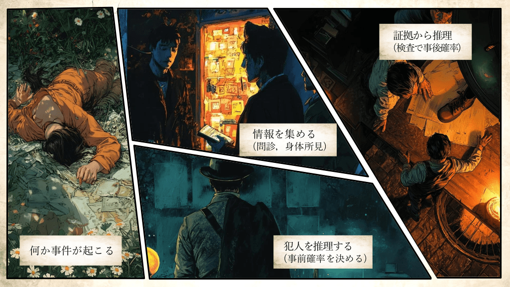 #10. 証拠から推理 (検査で事後確率) 情報を集める (問診,身体所見) 犯人を推理する (事前確率を決める) 何か事件が起こる 犯人を推理する (事前確率を決める)