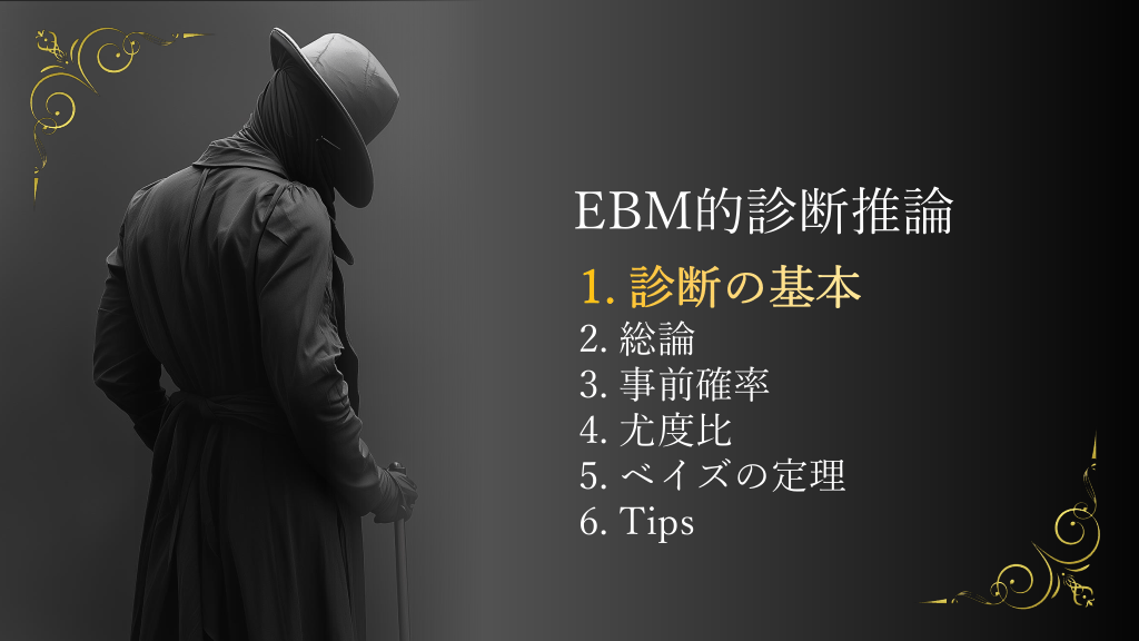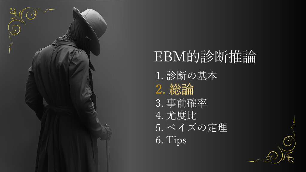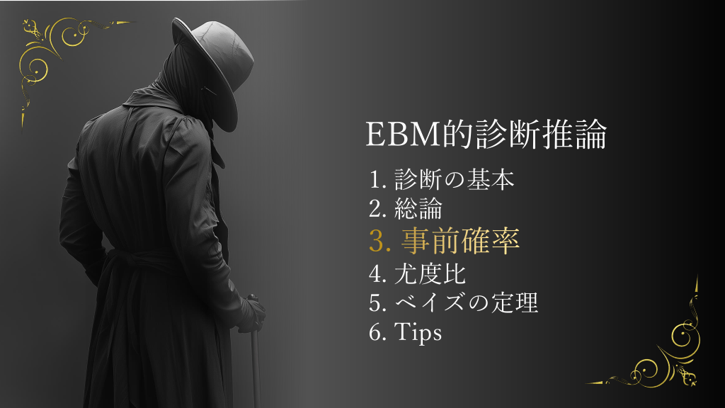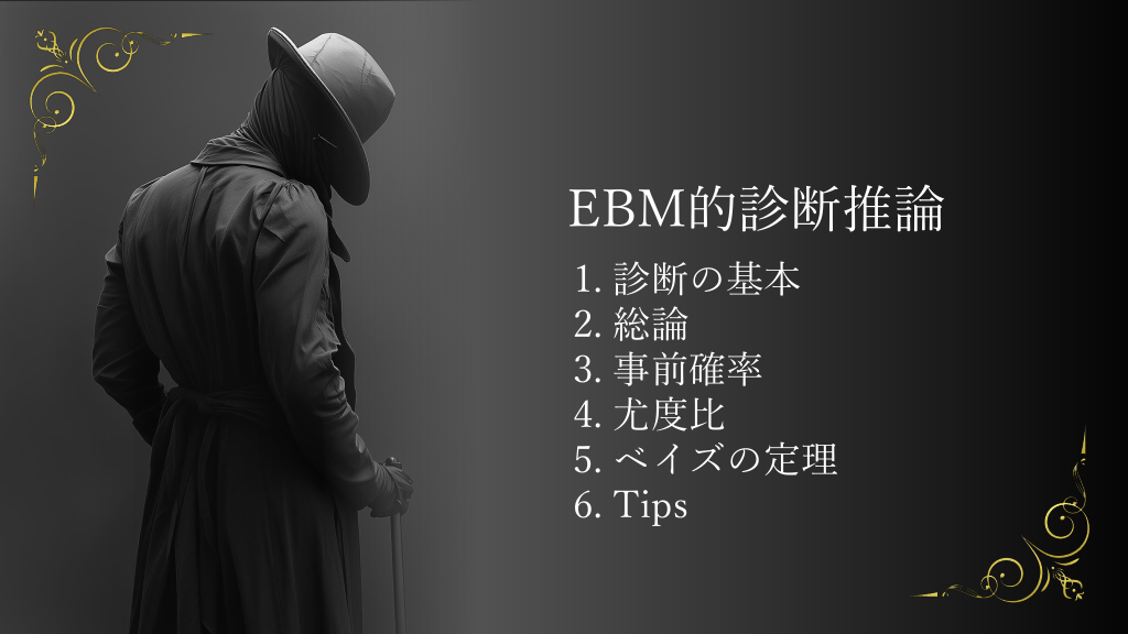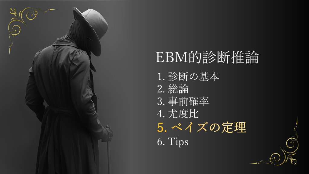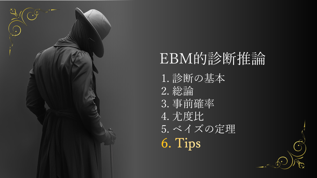#6. EBM的診断推論 1. 診断の基本 2. 総論 3. 事前確率 4. 尤度比 5. ベイズの定理 6. Tips