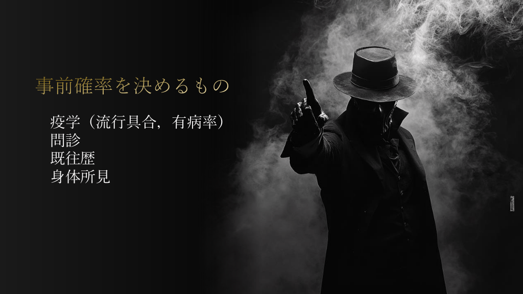 #19. 事前確率を決めるもの 疫学(流行具合,有病率) 問診 既往歴 身体所見