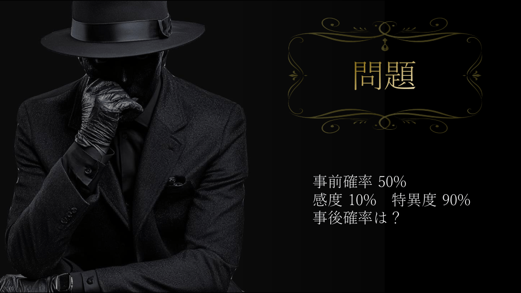 #2. 問題 事前確率 50% 感度 10% 特異度 90% 事後確率は?
