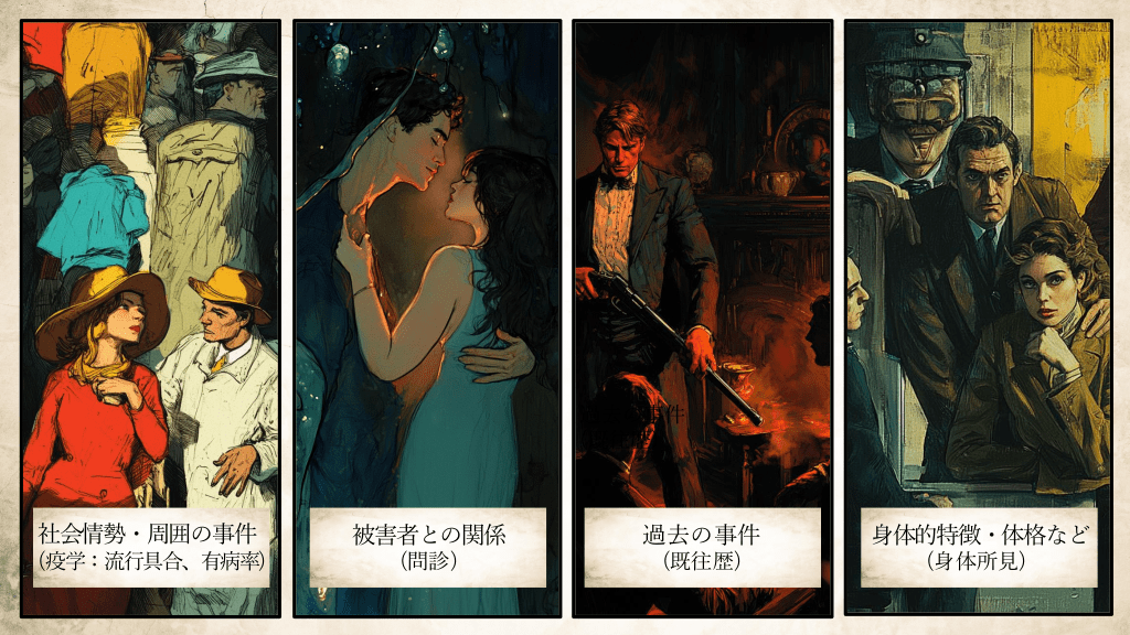 #20. 過去の事件 (既往歴) 社会情勢・周囲の事件 被害者との関係 過去の事件 身体的特徴・体格など (疫学:流行具合、有病率) (問診) (既往歴) (身体所見)