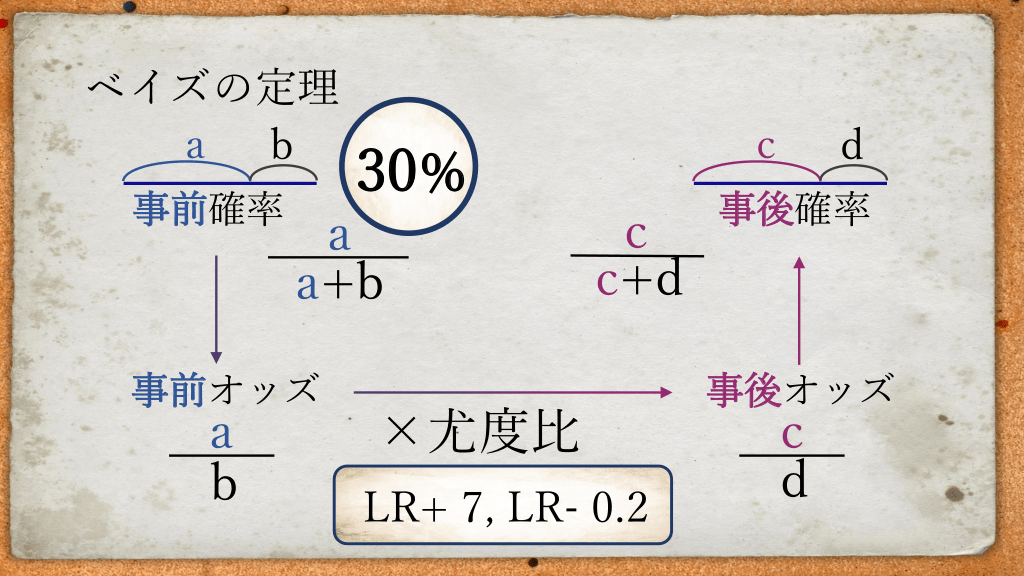 #29. ベイズの定理 a b 事前確率 a b 30% a a+b 事前オッズ c c c+d ×尤度比 LR+ 7, LR- 0.2 d 事後確率 事後オッズ c d