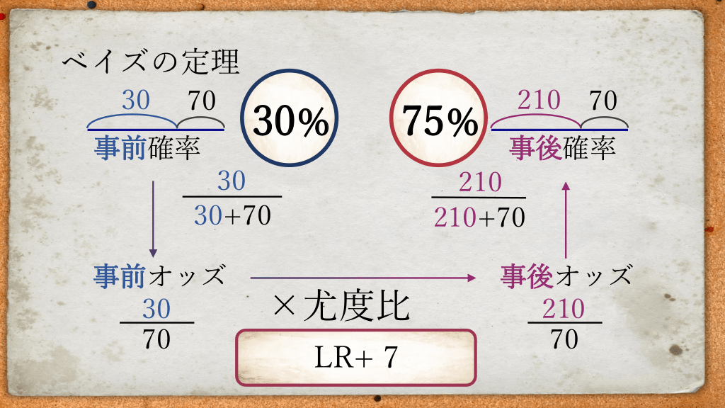 #30. ベイズの定理 30 70 事前確率 30% 75% 30 30+70 事前オッズ 30 70 210 70 事後確率 210 210+70 ×尤度比 LR+ 7 事後オッズ 210 70