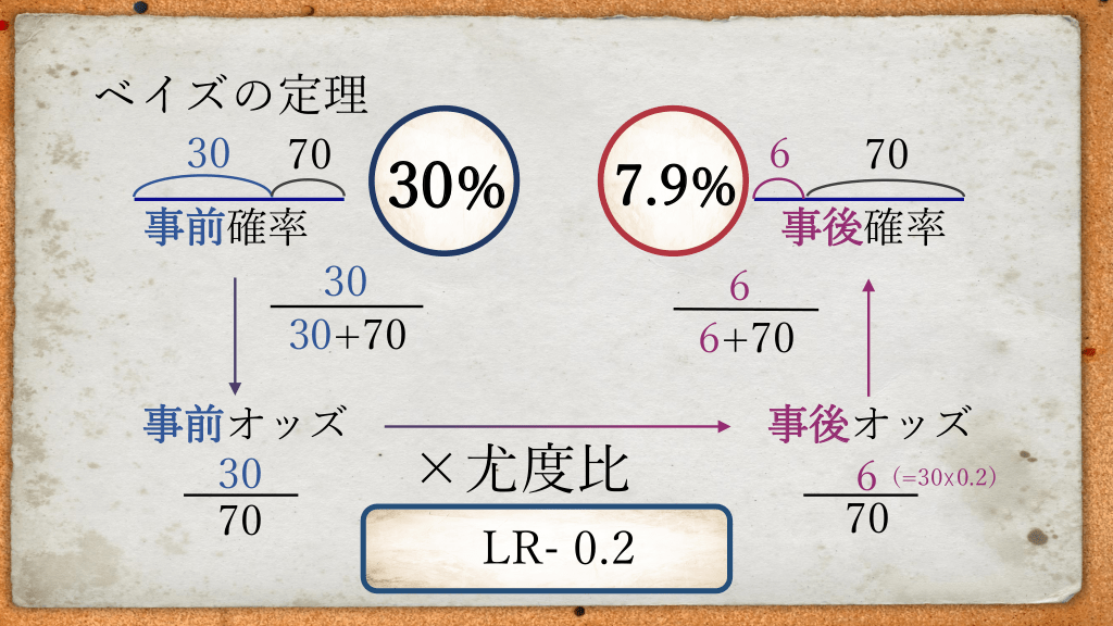 #31. ベイズの定理 30 70 事前確率 30% 7.9% 30 30+70 事前オッズ 30 70 6 70 事後確率 6 6+70 ×尤度比 LR- 0.2 事後オッズ 6 (=30☓0.2) 70
