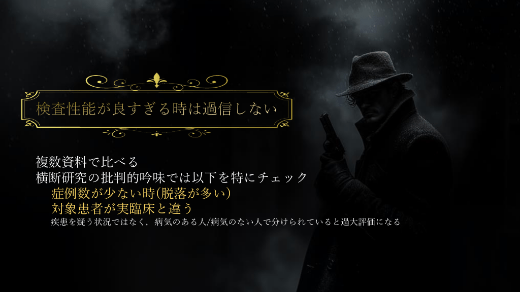#34. 検査性能が良すぎる時は過信しない 複数資料で比べる 横断研究の批判的吟味では以下を特にチェック 症例数が少ない時(脱落が多い) 対象患者が実臨床と違う 疾患を疑う状況ではなく,病気のある人/病気のない人で分けられていると過大評価になる