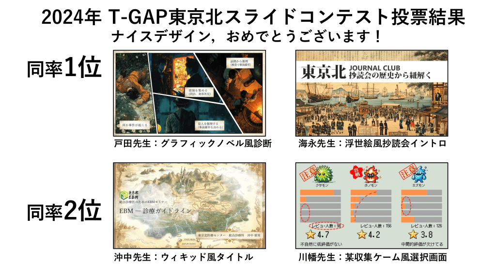 #37. 2024年 T-GAP東京北スライドコンテスト投票結果 ナイスデザイン,おめでとうございます! 同率1位 戸田先生:グラフィックノベル風診断 海永先生:浮世絵風抄読会イントロ 沖中先生:ウィキッド風タイトル 川幡先生:某収集ケーム風選択画面 同率2位