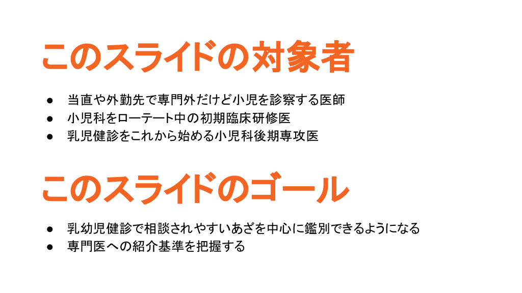#2. このスライドの対象者 ● ● ● 当直や外勤先で専門外だけど小児を診察する医師 小児科をローテート中の初期臨床研修医 乳児健診をこれから始める小児科後期専攻医 このスライドのゴール ● ● 乳幼児健診で相談されやすいあざを中心に鑑別できるようになる 専門医への紹介基準を把握する