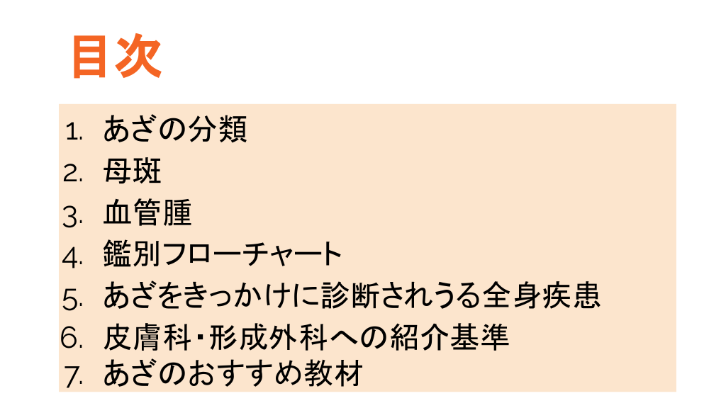 #3. 目次 1. 2. 3. 4. 5. 6. 7. あざの分類 母斑 血管腫 鑑別フローチャート あざをきっかけに診断されうる全身疾患 皮膚科・形成外科への紹介基準 あざのおすすめ教材